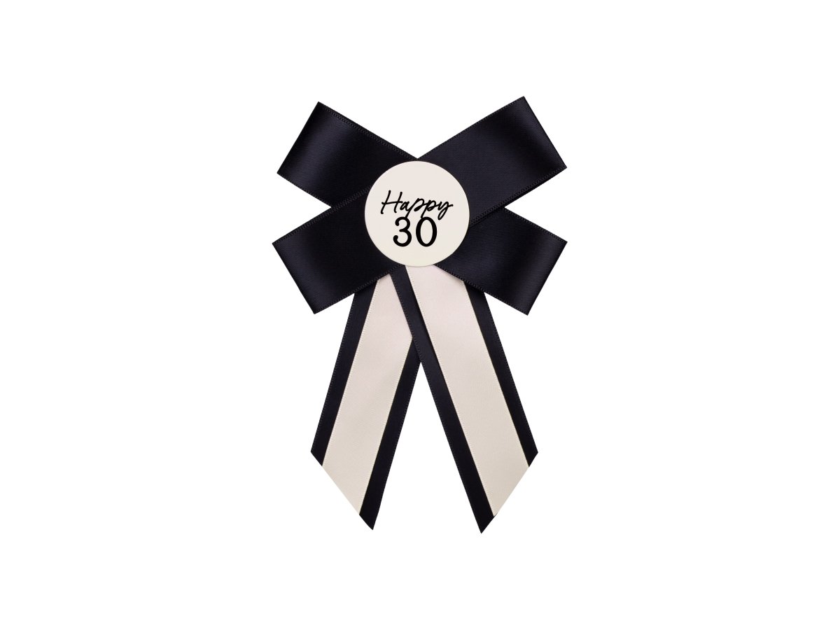 Botón para 30 cumpleaños en color crema y negro, dimensiones aproximadas 11 x 17 cm. El botón viene con un imperdible.