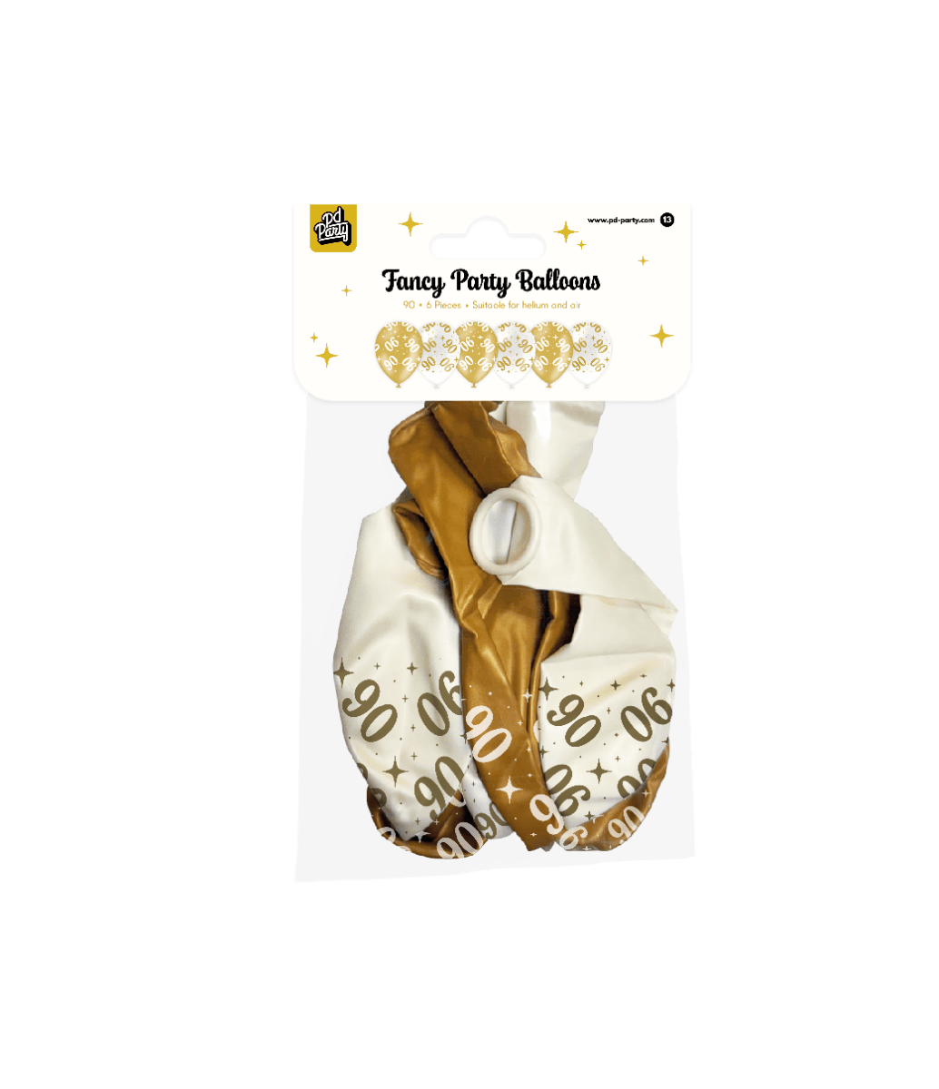 Los Globos de Fiesta Fancy - 90 de Paper Dreams son un complemento elegante para cualquier fiesta. Estos globos dorados/blancos impresos "90" están hechos de látex de alta calidad y llaman la atención por su aspecto lujoso.