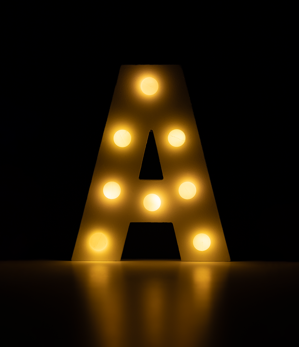 Con las letras luminosas, crea tus propias palabras y frases de formas atmosféricas. Incluye una pila.