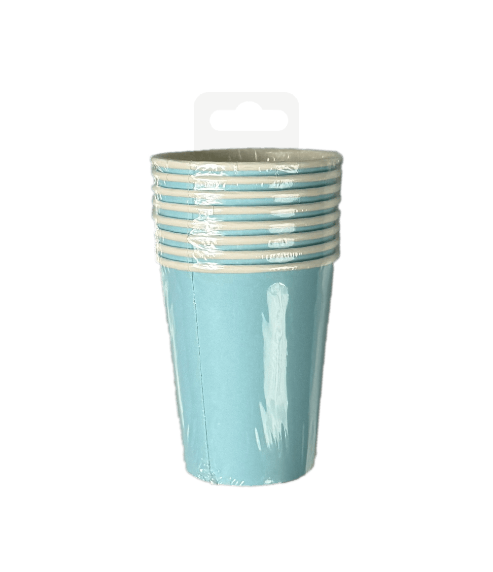 Los Vasos - Azul pastel son los artículos de decoración perfectos en una fiesta cuyo tema sea el color azul pastel. Estas tazas miden 8,5 x 7 cm, se presentan en paquetes de 8 y combinan perfectamente con los demás artículos azul pastel, como el confeti, las servilletas, los platos, los manteles, las cajas de aperitivos y la línea de banderines. Presenta estos artículos juntos para que al cliente le quede claro de inmediato en qué consiste esta colección. Estos vasos son de papel, por lo que son ecológicos