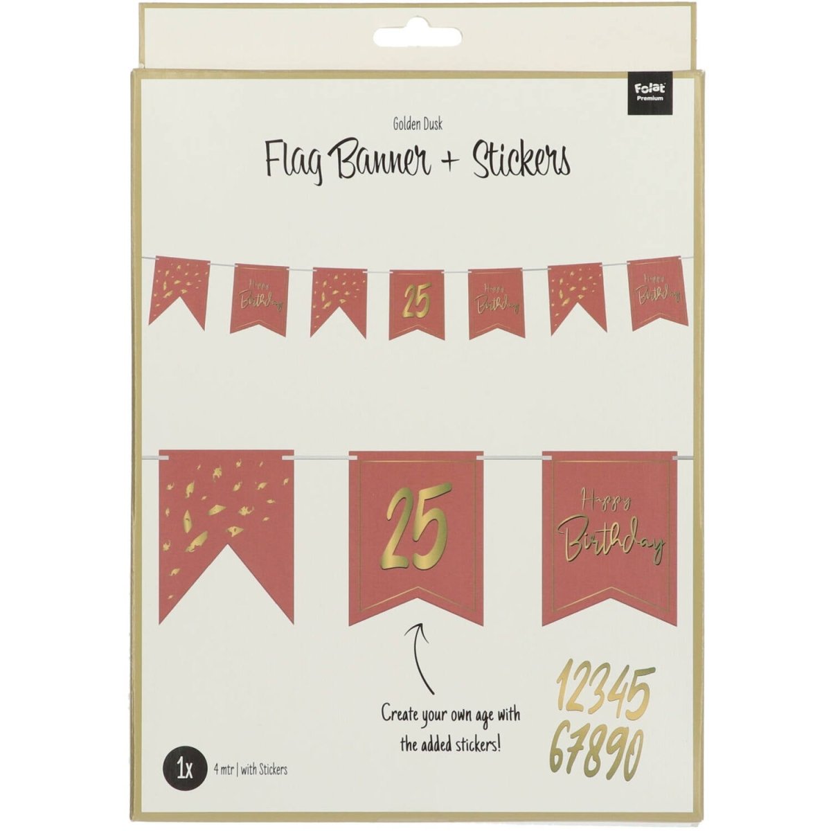 Haz que una celebración de cumpleaños sea aún más personal con esta Bandera DIY en Crepúsculo Dorado. La línea de bandera tiene un cálido color terracota y lleva 10 banderas impresas por ambas caras. Gracias a las pegatinas incluidas, puedes añadir fácilmente la edad del cumpleañero o cumpleañera. Perfecto para cumpleaños y fiestas infantiles, y fácil de combinar con otras decoraciones para fiestas.