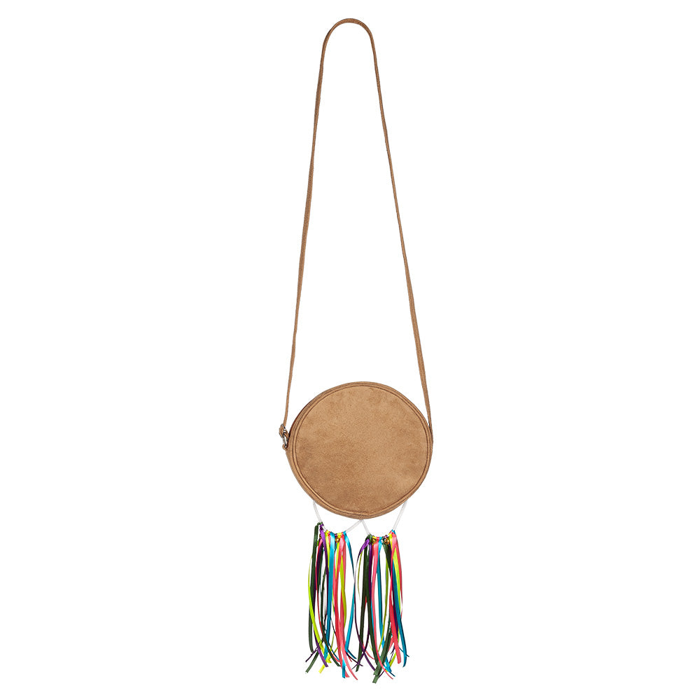 Vuelve a los años del flower power con esta colorida bandolera hippie. El diseño redondo con el signo de la paz y alegres lazos da a cualquier conjunto un aire retro y juguetón de los 70. Perfecto para festivales, fiestas temáticas o un día de verano.