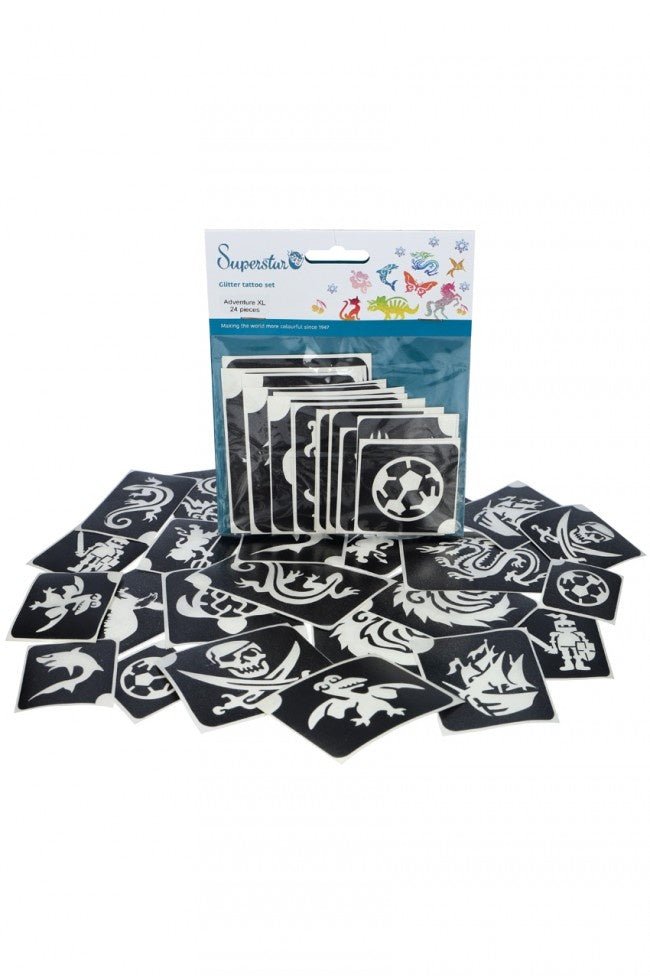 El set contiene 24 plantillas para tatuajes de purpurina. Utiliza el pegamento especial para piel y purpurina fina para crear deslumbrantes tatuajes de purpurina.