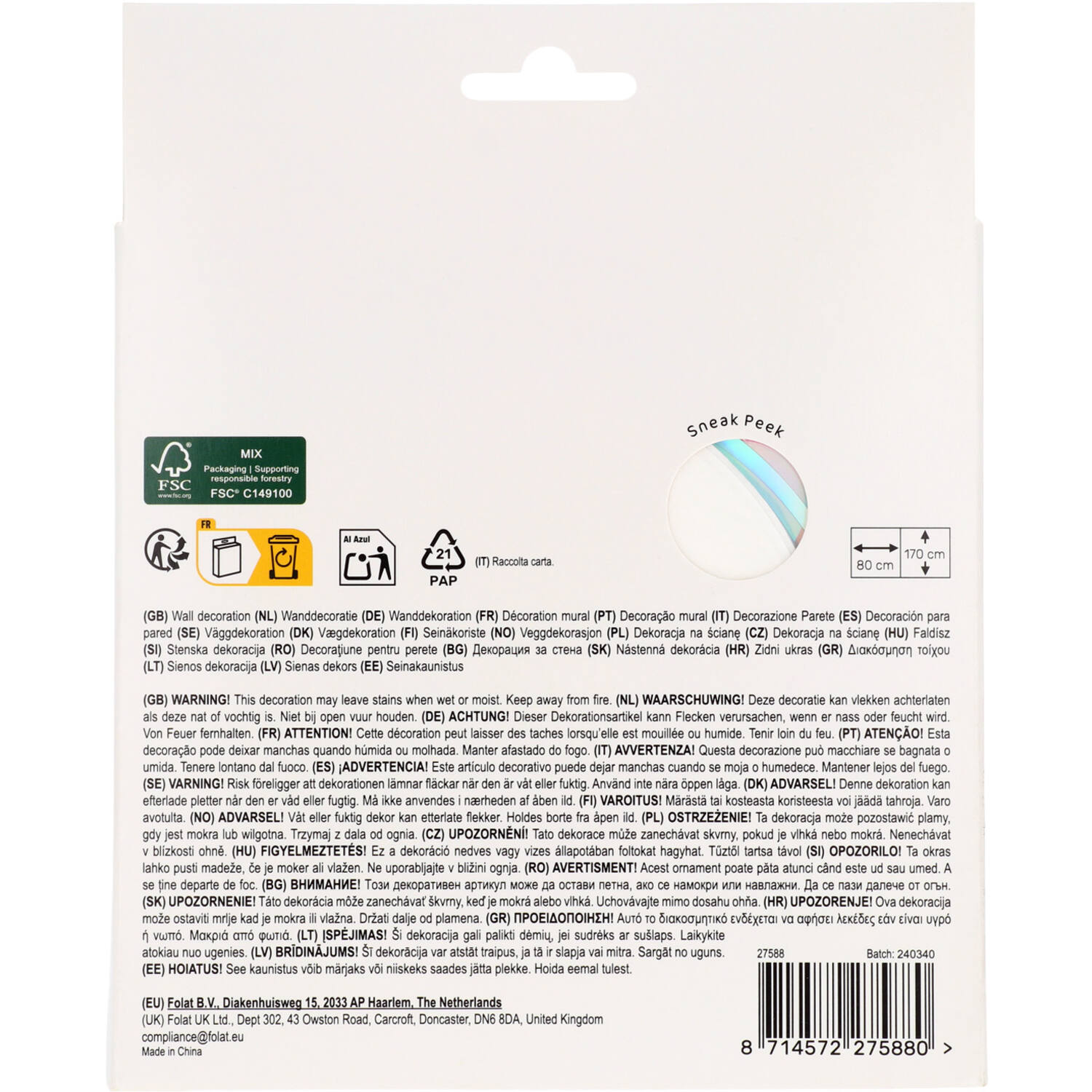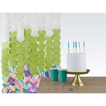 Fondos Mágicos DIY. Telón de fondo para fiestas - "Rocío místico de la mañana" - Círculo - 80 x 170 cm. Contenido: 8 guirnaldas con 18 círculos cada una. Para utilizar, por ejemplo, en las siguientes fiestas/fiestas Cumpleaños, Fiesta temática. Esta cortina para fiestas consta de 8 guirnaldas con 18 círculos cada una y un diámetro de 7,5 cm. Cuélgalas exactamente como quieras. Si las cuelgas una al lado de la otra, crearás un telón de fondo de 170 x 80 cm. Hay 3 colores por guirnalda: blanco, verde e iridiscente. Este artículo está hecho de papel y papel de aluminio.