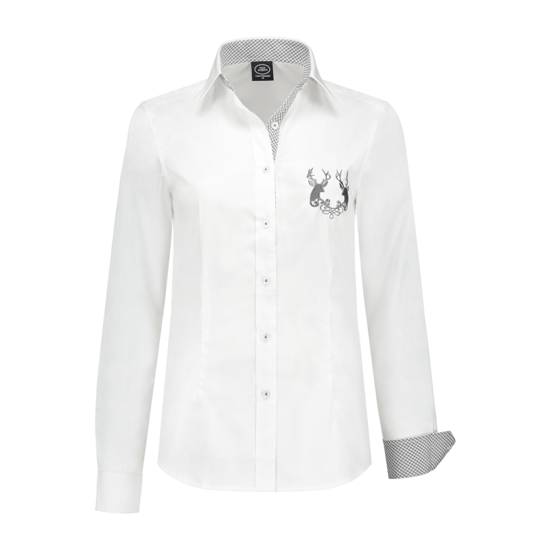 Blusa de mujer blanca, karo gris, bordado de ciervo en el pecho
