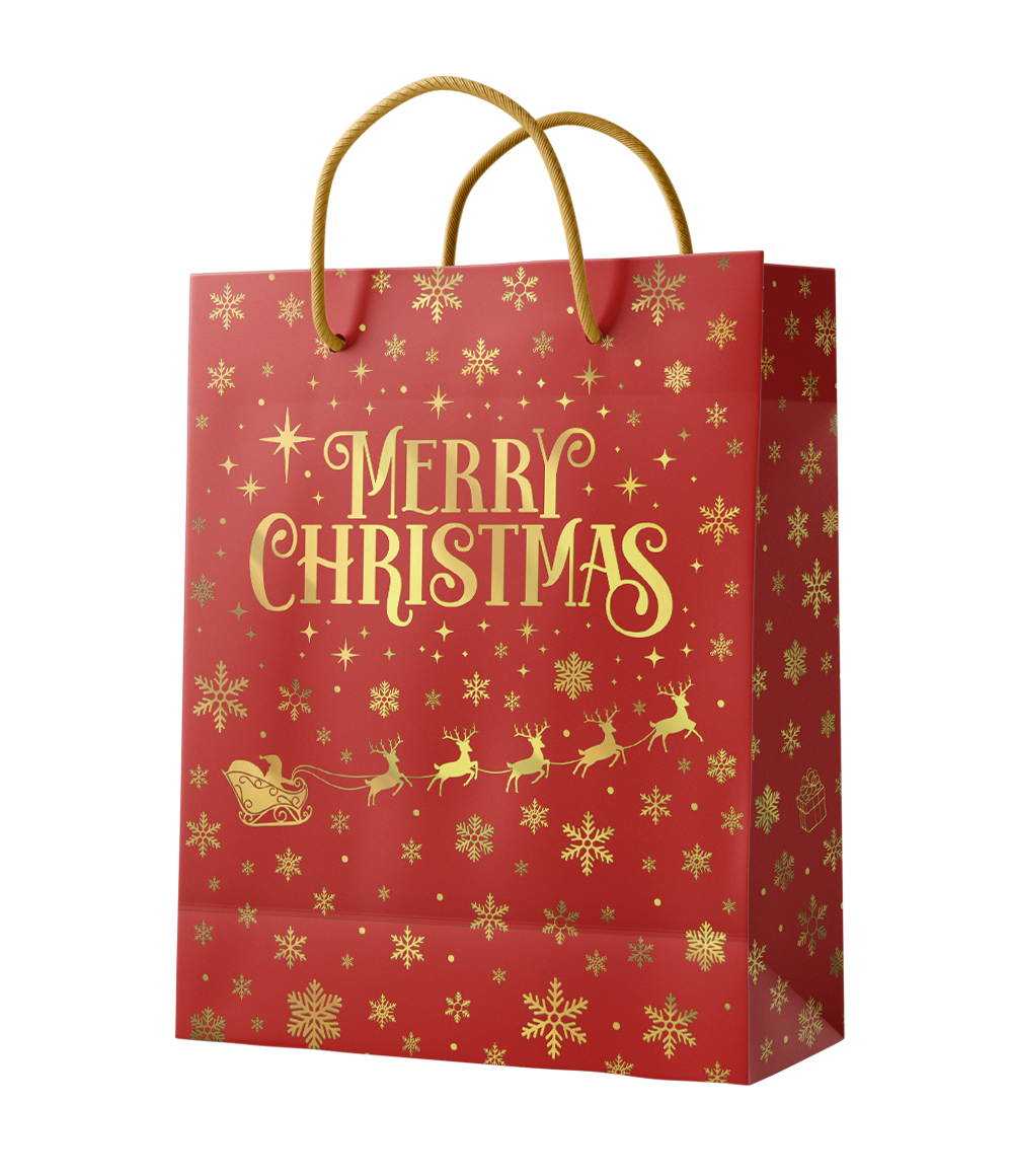 Da a tus regalos navideños un aspecto festivo con esta Bolsa de regalo Feliz Navidad de color rojo. La bolsa está hecha de papel y plástico resistentes y tiene un tamaño práctico, perfecto para regalos de tamaño mediano. Gracias a su alegre diseño, convertirás cada regalo en un auténtico reclamo bajo el árbol de Navidad.