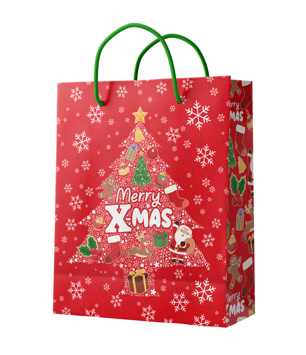 Envuelve tus regalos de Navidad con estilo con esta bolsa de regalo grande de color rojo con motivos festivos navideños, como renos, copos de nieve y el texto Feliz Navidad. Gracias a su alegre diseño, la bolsa atraerá todas las miradas bajo el árbol de Navidad