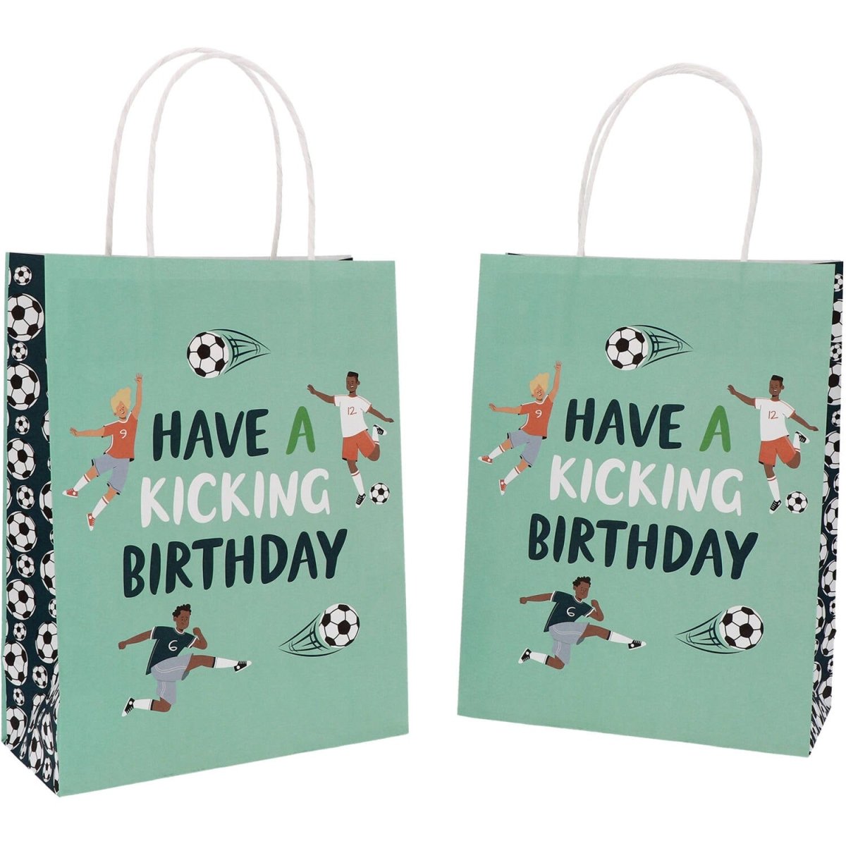 Un regalo para todos los futbolistas. Bolsas de regalo - Fútbol Fantástico - 20 x 27 cm - 6 piezas. Contenido: 6 bolsas de regalo. Para utilizar, por ejemplo, en las siguientes fiestas/fiestas Fiesta infantil, Cumpleaños. Alegres bolsas de regalo de 20 x 27 x 10 cm. De color azul e impresas por ambos lados con el texto "TEN UN CUMPLEAÑOS FELIZ" y tres futbolistas, los laterales están impresos con balones de fútbol. Incluyendo el asa, las bolsas miden unos 37 cm de alto. Estas bolsas de regalo pertenecen a la colección Fútbol Fantástico de