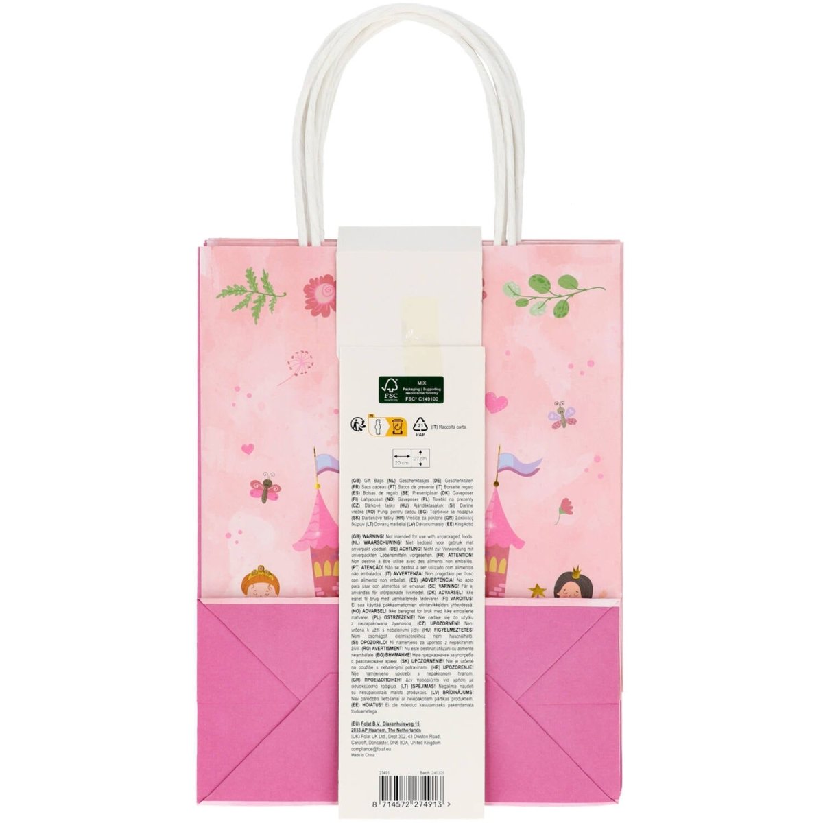 Para regalos reales. Bolsas de regalo - Princesa bonita - 20 x 27 cm - 6 piezas. Contenido: 6 bolsas de regalo. Para utilizar, por ejemplo, en las siguientes fiestas/fiestas Fiesta infantil, Cumpleaños. Bonitas bolsas de regalo de 20 x 27 x 10 cm. De color rosa suave, con dos princesas y el texto "FELIZ DÍA DE CUMPLEAÑOS" en una cara y un castillo con dos princesas en la otra. Incluyendo el asa, las bolsas miden unos 37 cm de alto. Con detalles dorados que realmente brillan gracias a la técnica de estampación en caliente utilizada. Estas bolsas de regalo pertenecen a la colección Pretty Princess de Folat. Este artículo está hecho de papel.