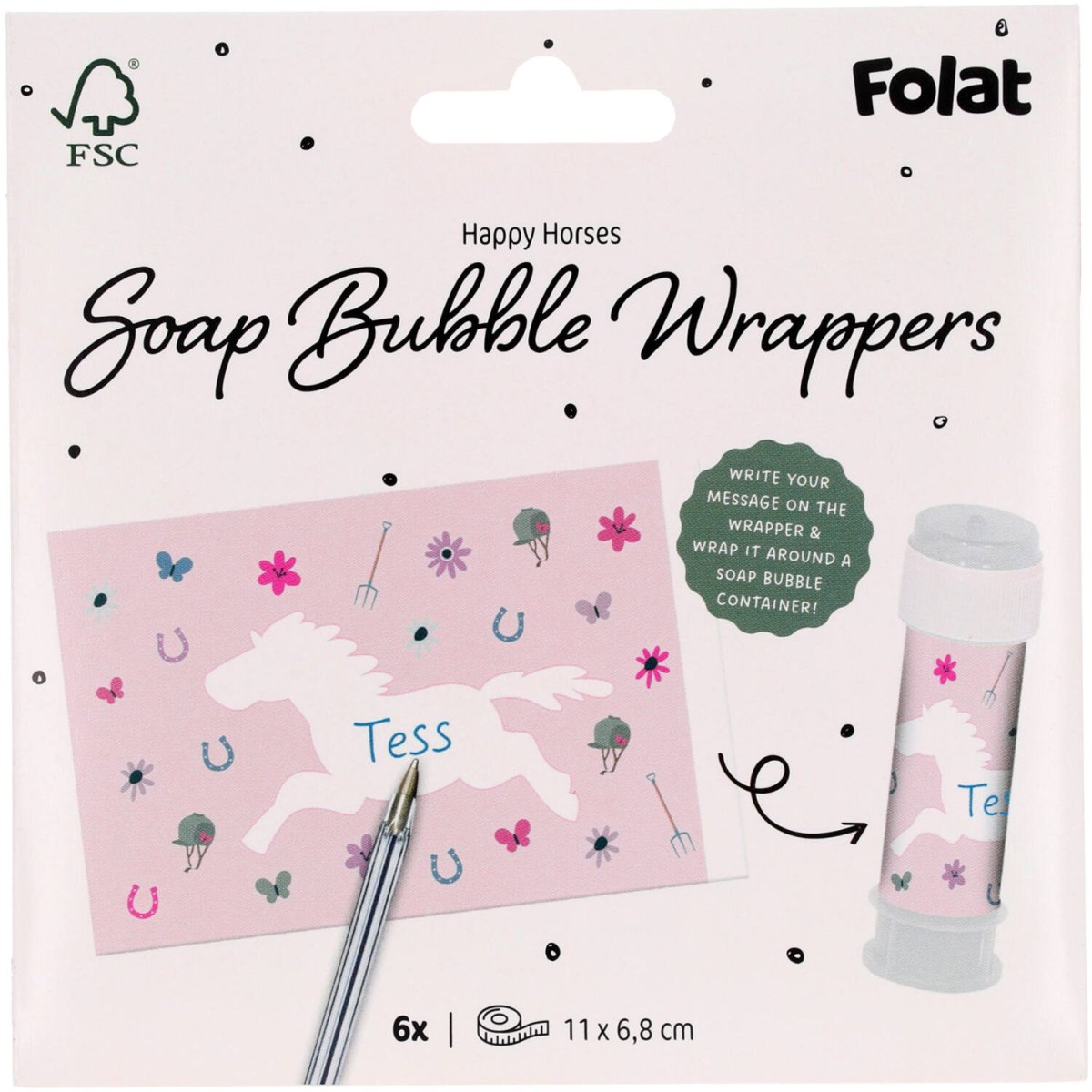 Para cada aficionado a los caballos un soplador de burbujas. Pegatinas soplador de burbujas - Caballo feliz -6 piezas. Contenido: 6 pegatinas para soplar burbujas. Para utilizar, por ejemplo, en las siguientes fiestas/fiestas Fiesta infantil, Cumpleaños, Fiesta temática. El soplador de burbujas de todos. Estas pegatinas de caballo para soplar burbujas caben en una botella estándar para soplar burbujas y tienen un tamaño de: 11 x 6,8 cm. Están impresas por una cara. Estas pegatinas para soplar burbujas pertenecen a la colección Caballos Felices de Folat. Este artículo está hecho de papel.