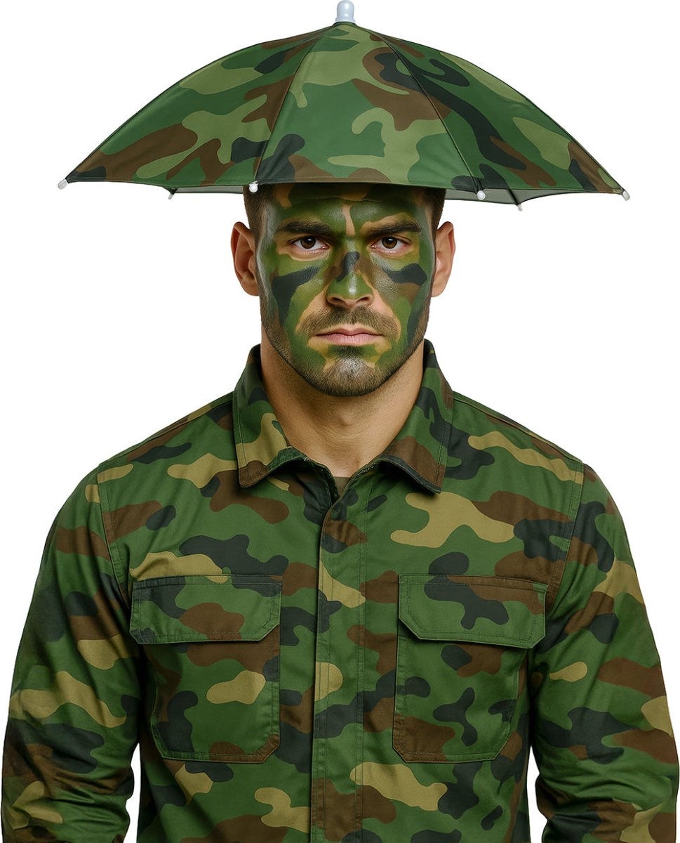 Mantén la cabeza seca con este práctico paraguas militar para la cabeza. La cinta ajustable para la cabeza facilita el transporte del paraguas sin usar las manos, ideal para actividades al aire libre, festivales o fiestas temáticas. El aspecto de camuflaje verde lo convierte en un accesorio divertido y funcional para adultos.