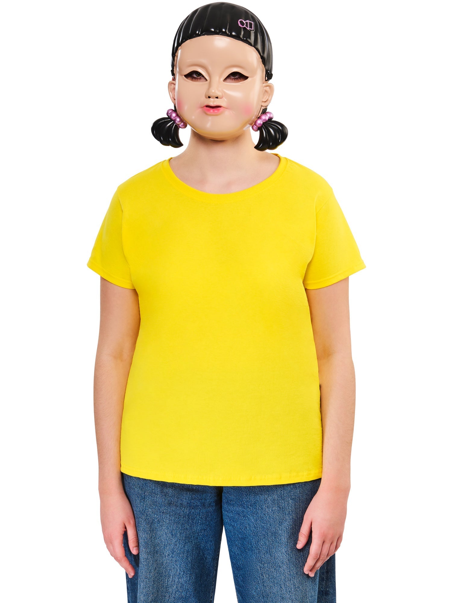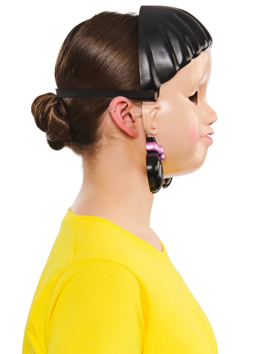 Conviértete en el espeluznante y misterioso personaje de la icónica Muñeca Chica de Juego del Calamar con esta media máscara cuidadosamente moldeada. Perfecta para combinar con un disfraz y conseguir un look de Halloween completo.