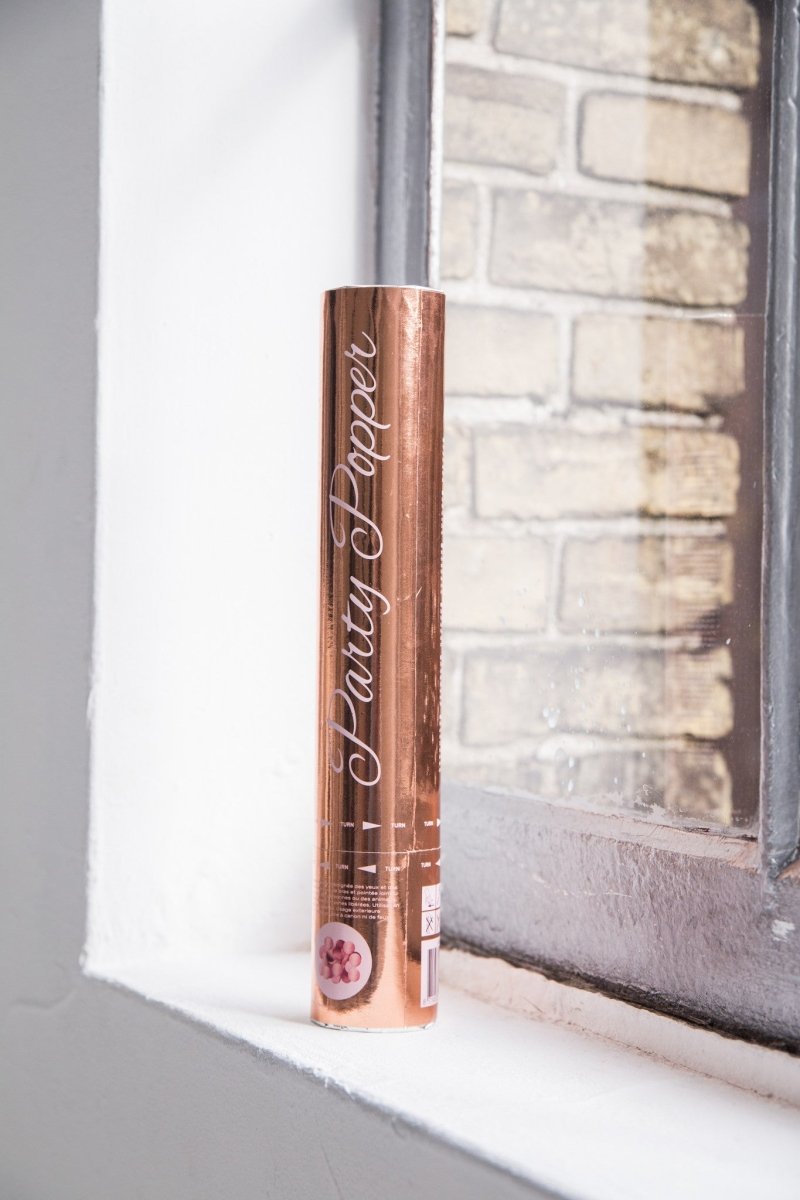 Cañón de confeti Oro rosa - 28cm. Contenido: 1 cañón de confeti. Color: oro rosa. Para utilizar, por ejemplo, en las siguientes fiestas: cumpleaños, fiesta infantil o aniversario. El artículo mide 28 cm de largo. El confeti es de papel de aluminio.