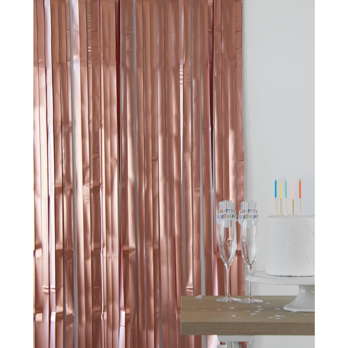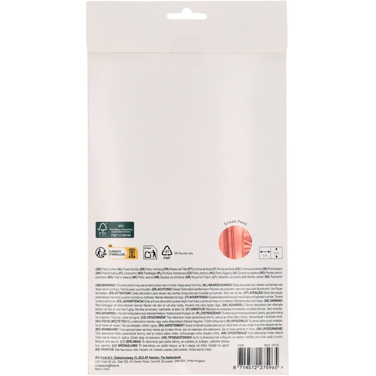 Un suave destello. Cortina de fiesta - Oro rosa mate - 1 x 2 m. Contenido: 1 cortina de fiesta. Para utilizar, por ejemplo, en las siguientes fiestas/fiestas Cumpleaños, Fiesta temática. Una preciosa cortina de fiesta con anchas tiras de color rosa de 2,5 cm de ancho. Bonita como cortina para puertas, pero también muy adecuada como telón de fondo para fotos especiales. Gracias al práctico borde adhesivo, esta cortina para fiestas es fácil de colgar. Este artículo está hecho de papel de aluminio.