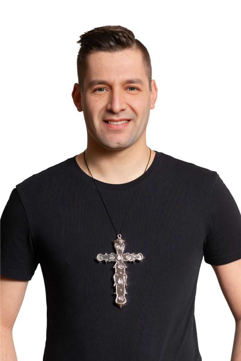 El collar Cruz de plata es un accesorio elegante y llamativo que combina a la perfección con una gran variedad de disfraces y atuendos temáticos. Ideal para añadir un brillo extra a un atuendo durante carnavales, fiestas de disfraces y otras ocasiones festivas.