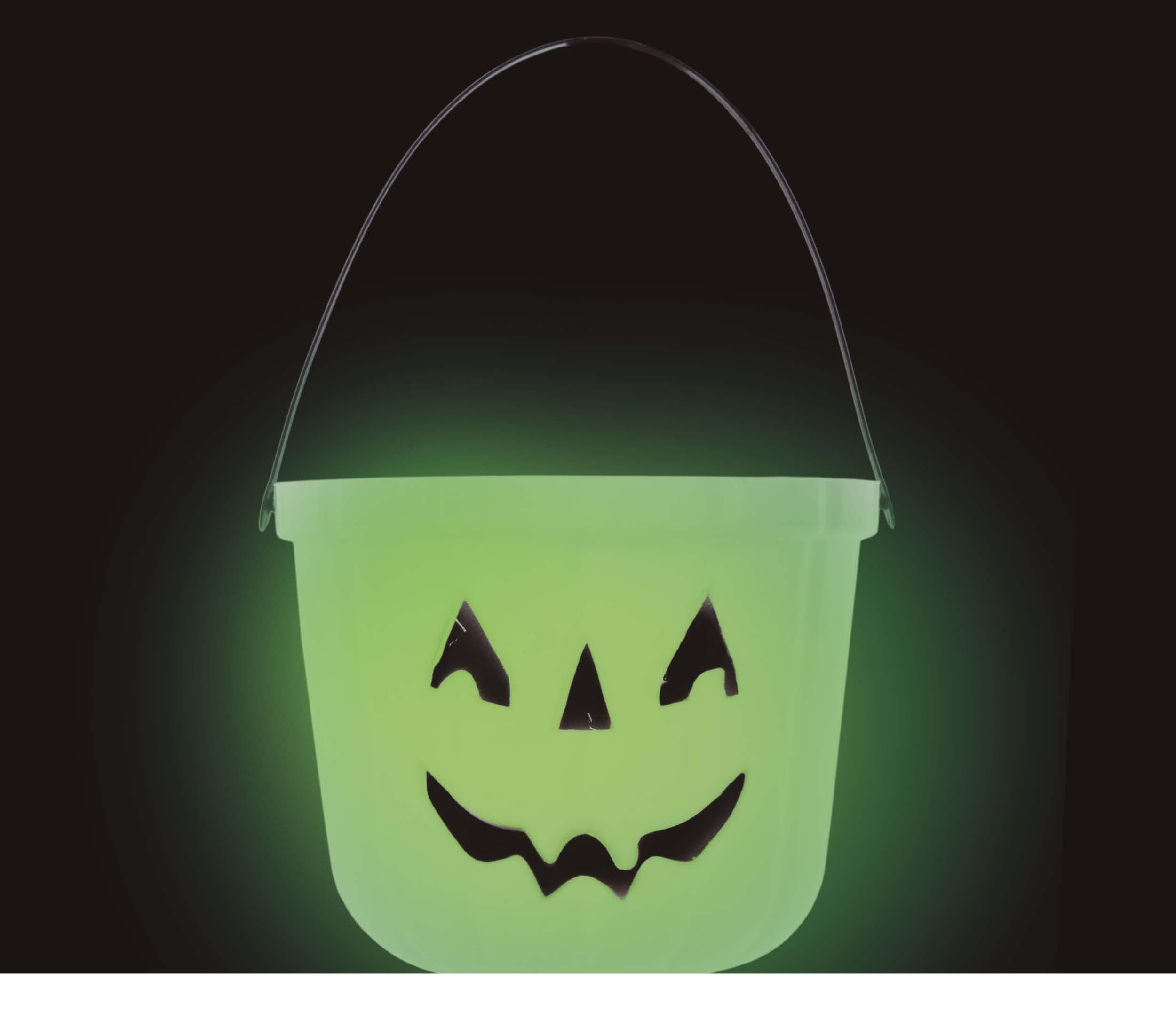 Cubo de calabaza de Halloween que brilla en la oscuridad