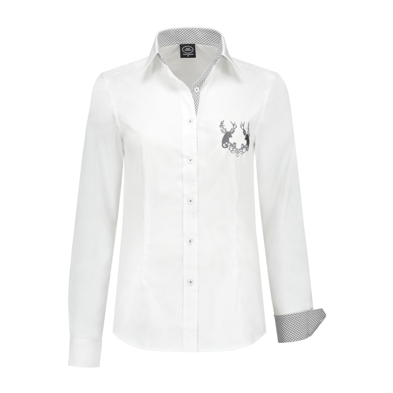 Damesblouse wit, grijs karo, hert borduur op borst