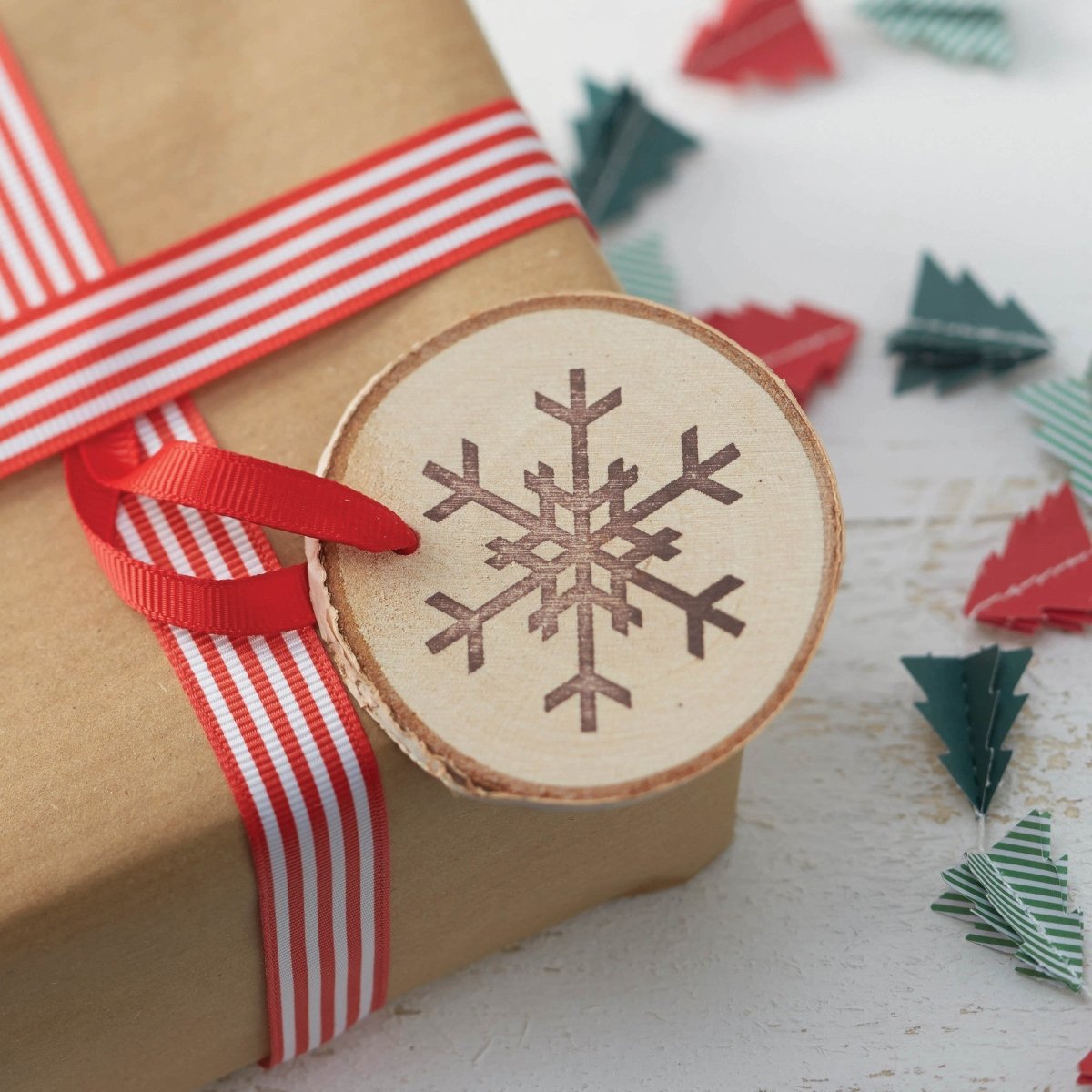 Cada paquete contiene 6 decoraciones colgantes de madera con un copo de nieve impreso a cada lado de la decoración. Cada etiqueta de madera también tiene una cinta roja ya atada con un nudo para facilitar su colocación. Ten en cuenta que el estampado de cada copo de nieve marrón puede diferir de la imagen del producto mostrada.