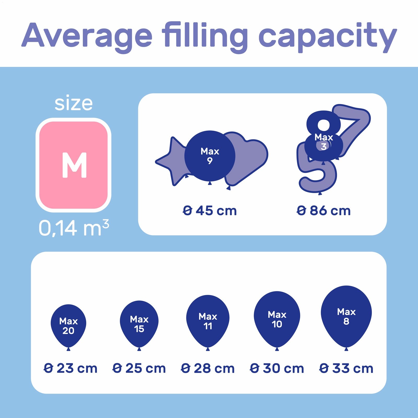 Cada centímetro más grande que sea un globo afecta a su capacidad. Los depósitos de helio se basan en globos de 25 cm, si utilizas globos de 30 cm, por ejemplo, sólo podrás sacar la mitad de la cantidad del depósito de helio.
