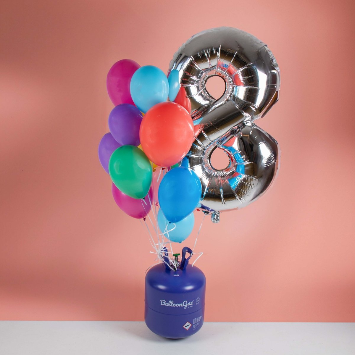 Uso del depósito de helio: depósito de helio 80 (no reutilizable) con válvula de llenado, sin globos ni cinta