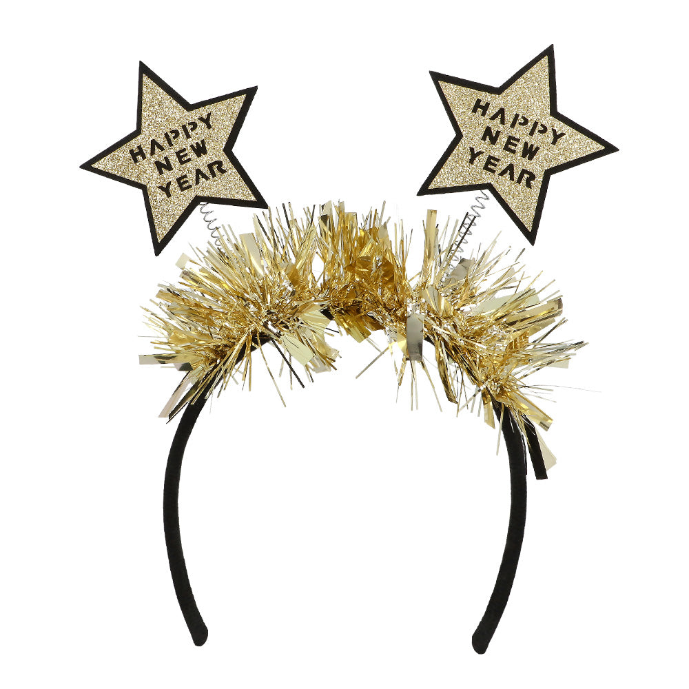¡Entra brillante en el nuevo año con esta diadema festiva! La diadema negra está decorada con brillantes oropeles dorados y dos estrellas centelleantes en las que se lee "Feliz Año Nuevo" . Las estrellas se mueven alegremente a cada paso, para que destaques durante la cuenta atrás.