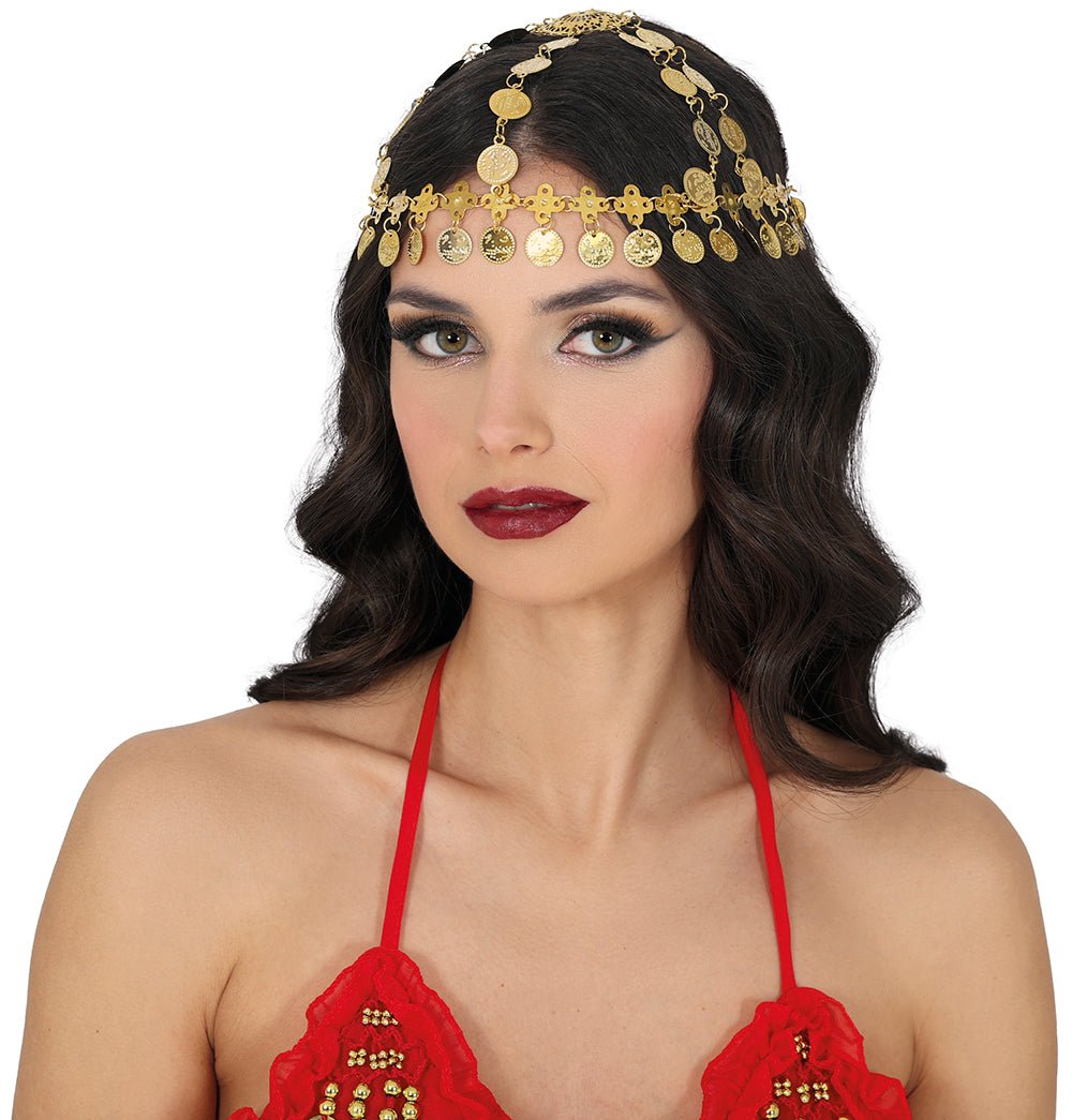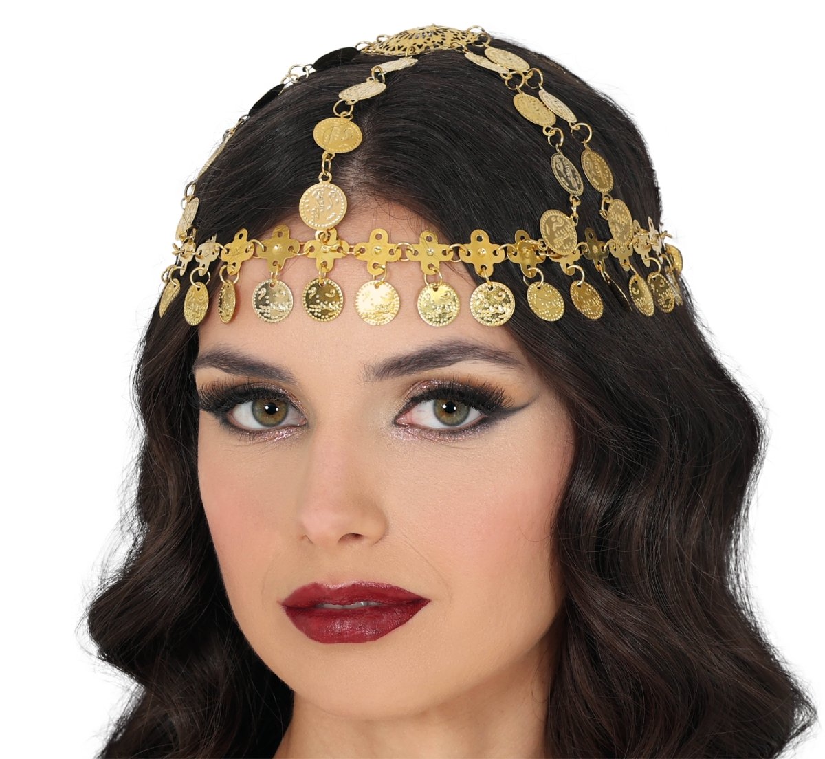 Dale a tu atuendo un aspecto elegante y festivo con esta diadema de oro con monedas. Ideal como accesorio para fiestas temáticas, espectáculos de baile o como detalle llamativo con un disfraz. La diadema es ligera y cómoda de llevar.