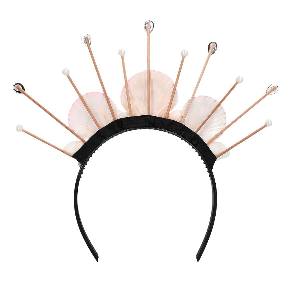 Una bonita corona halo con conchas rosas y piedras brillantes para un mágico look boho. La diadema encaja perfectamente con un traje de festival o de playa con influencias oceánicas, pero también es sin duda un accesorio único para completar un disfraz de sirena para Carnaval o una fiesta de disfraces.