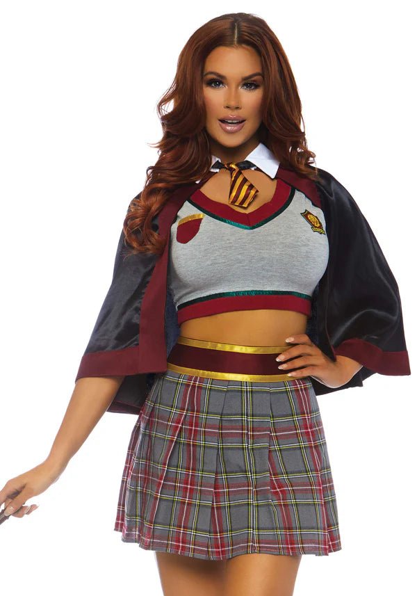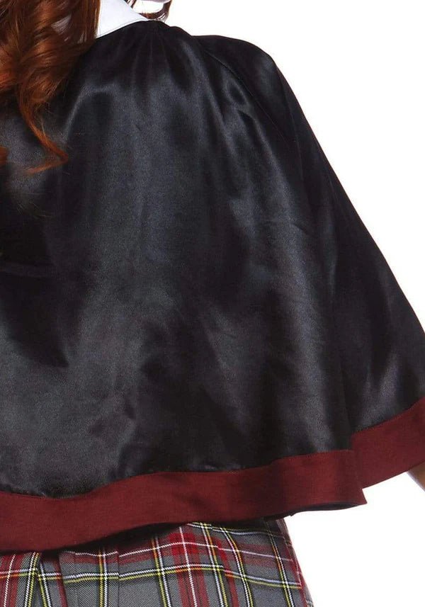 ¡Muestra tus habilidades mágicas con el Conjunto Escolar Hechizante de 3 piezas de Leg Avenue! Este encantador conjunto incluye un top con detalles de chapas, una falda de cuadros de cintura alta y un capa con lazo. ¡Perfecto para Halloween, fiestas temáticas o un look de cosplay mágico! 🖤📚