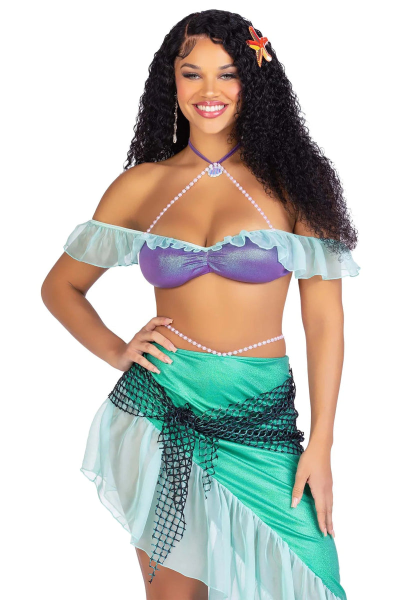 ¡Transfórmate en una encantadora sirena con el Conjunto de Sirena de 3 piezas de Leg Avenue! Este conjunto mágico incluye un sujetador halter de perlas iridiscentes con volantes de gasa, que te da un elegante aspecto de sirena. La falda asimétrica tiene una cinturilla de perlas y una envoltura de red iridiscente, creando un efecto encantador y mágico que te transportará a las profundidades del océano.