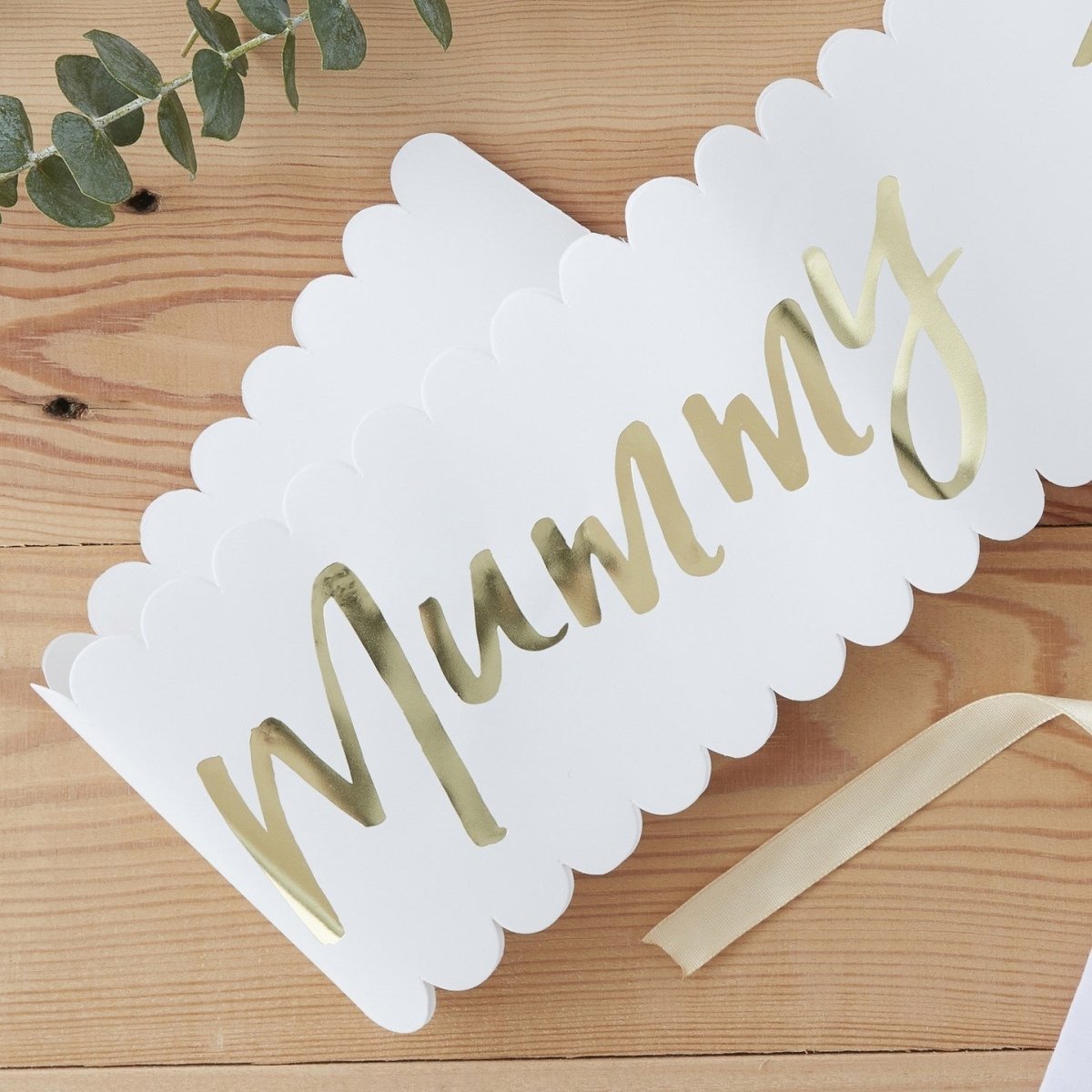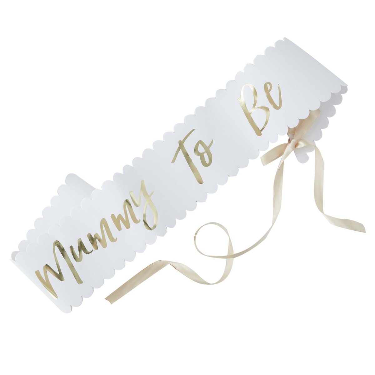 Nuestro fajín de futura mamá tiene un bonito texto dorado con la inscripción "Mamá futura" sobre un fondo de papel blanco suave. Un adorable toque final para crear recuerdos especiales. Echa un vistazo a nuestra gama Oh Baby para encontrar decoraciones doradas a juego para la fiesta del bebé y continuar con el tema.