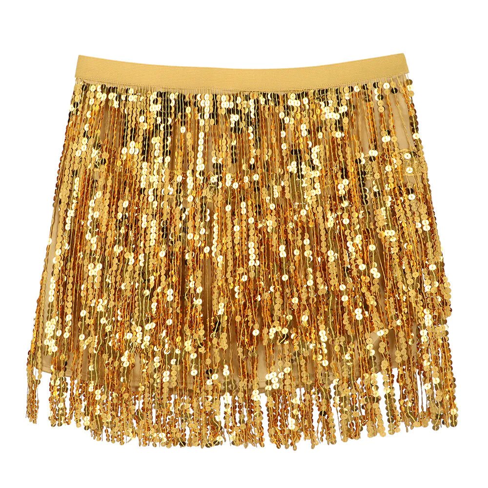 ¡Déjate brillar con esta minifalda dorada brillante! Decorada con lentejuelas brillantes y volantes juguetones, la falda se mueve a cada paso para un efecto irresistible. Perfecta para fiestas, carnavales o fiestas de disfraces.