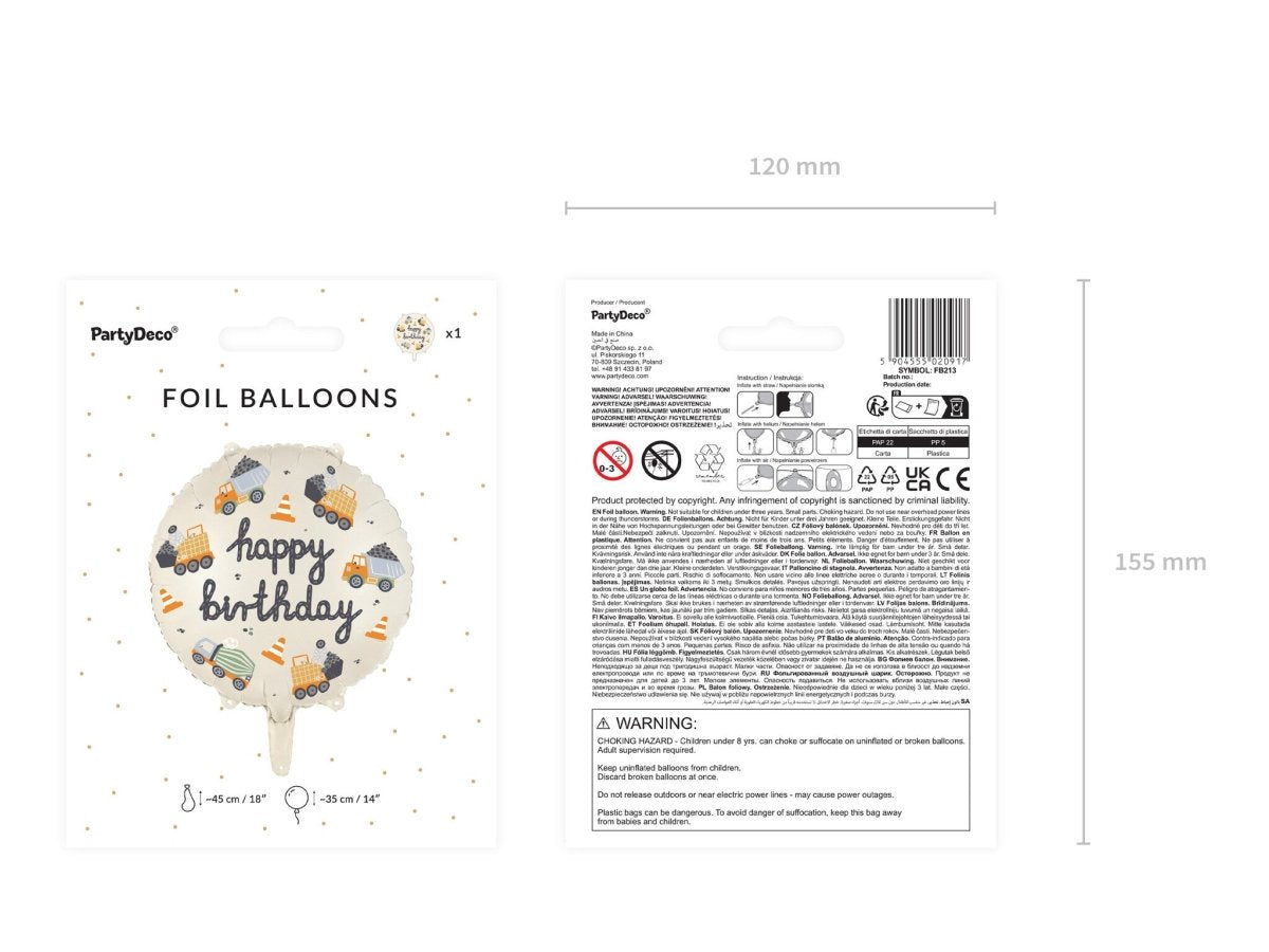 Feliz Cumpleaños Globo de Helio Vehículos de Construcción Vacío 45cm