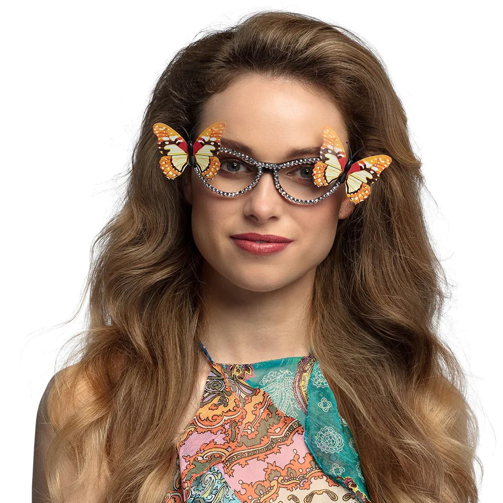 Estas particulares gafas retro son un complemento elegante y juguetón para cualquier conjunto de fiesta. Las gafas tienen montura de los años 50 con piedras brillantes y mariposas a los lados. Un accesorio estupendo para un disfraz de hippie o hada para fiestas temáticas o Carnaval.