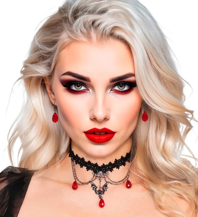 Esta gargantilla vampírica gótica con pendientes es un accesorio elegante para un look misterioso y oscuro. La gargantilla negra, el collar plateado y los colgantes rojos de diamantes falsos hacen que este conjunto sea perfecto para Halloween, Carnaval o una fiesta temática gótica.