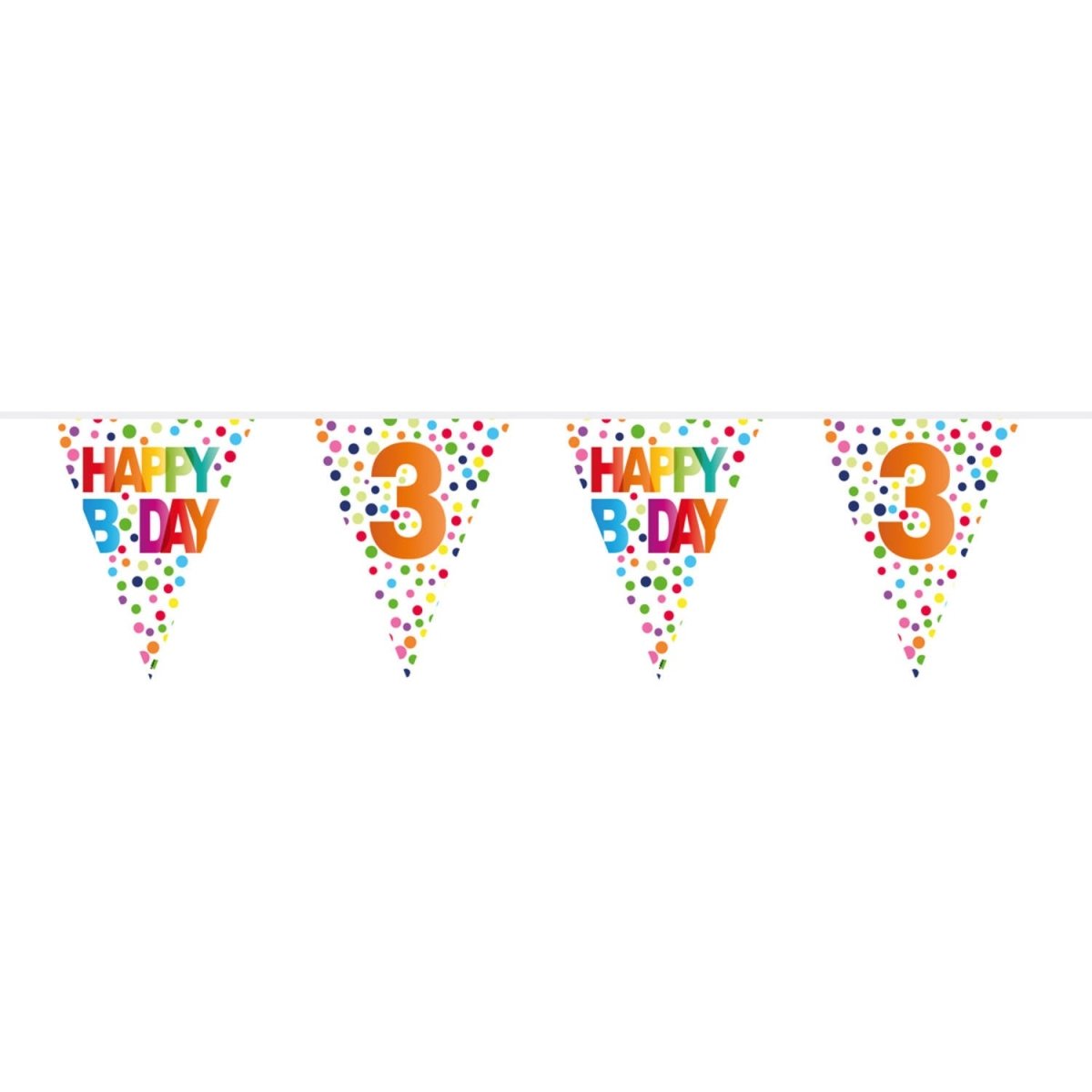 Línea de bandera 3 años Happy Bday Dots - 10 metros. Contenido: 1 línea de bandera. Color: Multicolor. Para utilizar, por ejemplo, en las siguientes fiestas o celebraciones: Cumpleaños, Fiesta infantil y Aniversario. Esta línea de bandera mide 10 metros de largo. El artículo está hecho de plástico.