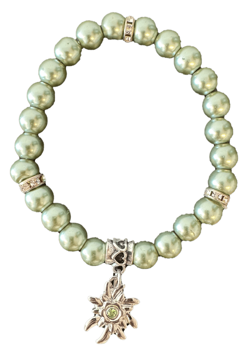 Añade un toque natural y elegante a cualquier atuendo con esta pulsera verde con perlas y edelweiss. Su elegante diseño hace que la pulsera sea adecuada para llevarla a diario o como regalo especial.