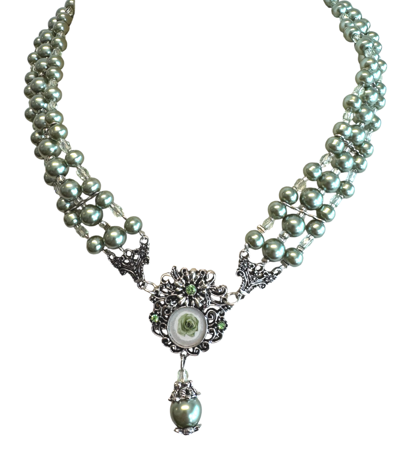 Añade un toque brillante a cualquier conjunto con este collar verde con perlas y brillantes. Su elegante diseño hace que el collar sea perfecto como accesorio para niños o adultos y también ideal como regalo.