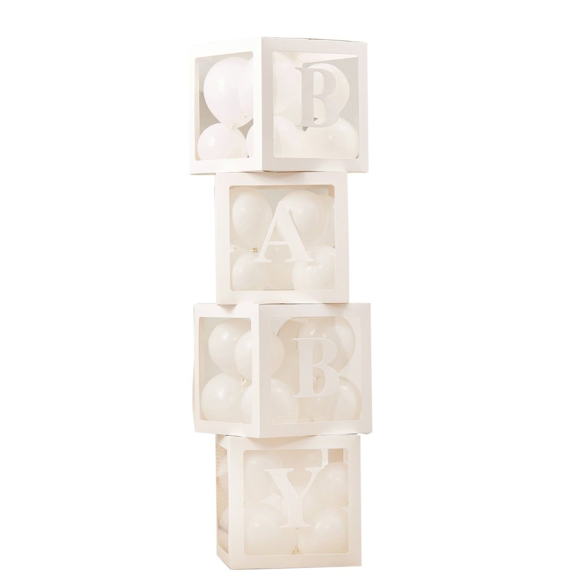 Cada paquete contiene 4 cajas de 30 cm x 30 cm con ventana de acetato. 60 globos blancos de 5 pulgadas 2 pegatinas B 1 pegatina A 1 pegatina Y