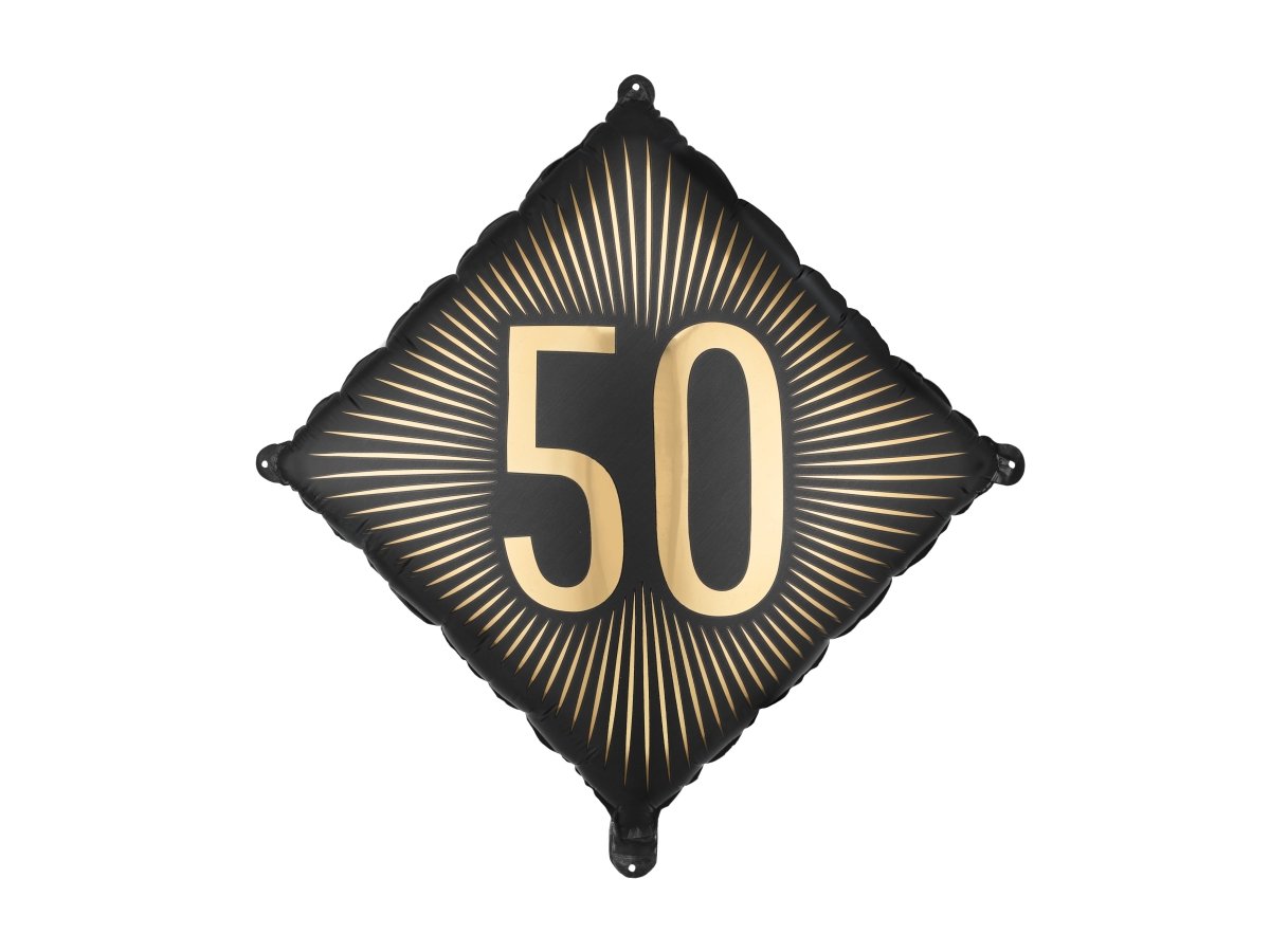 Celebra un 50.º cumpleaños o aniversario especial con este elegante globo de lámina negro con el número «50» impreso en dorado. Perfecto para una decoración elegante y festiva.