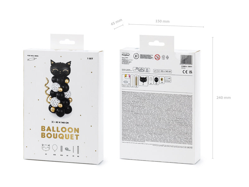 Ramo de globos Gato en color negro, el juego incluye: globos (33 piezas), globos de modelar (2 piezas),globo de papel de aluminio (1 pieza), pajita de papel (1 pieza), cinta de espuma (24 piezas) y eslinga para globos de 2,5 m. Tamaño aprox. 83 x 140 cm.