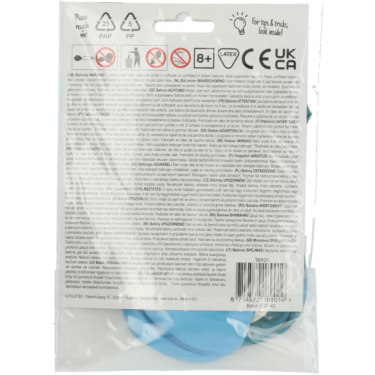 Contenido: 6 globos de látex Diámetro: 33 cm Color: Azul Edad: 1 año Material: Látex