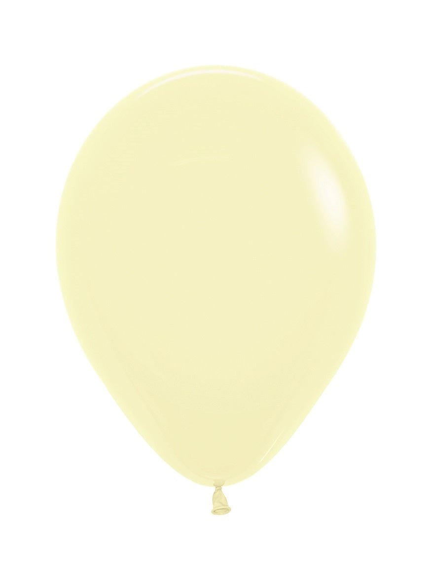 Tamaño: 25 cm Color: Amarillo pastel mate 620 Unidad de embalaje: 100 unidades Marca: Sempertex Helio: sí Aire: sí Consejo: Sempertex Los globos están hechos de látex 100% natural, procedente del árbol del caucho. Sempertex Todos los productos tienen certificación ISO y TUV.