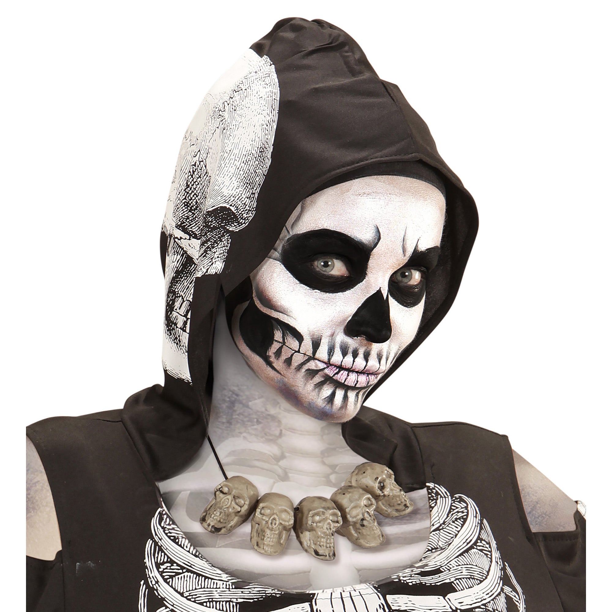 Completa tu atuendo de Halloween con este llamativo collar plateado decorado con calaveras. Ideal para espeluznantes fiestas de disfraces, fiestas temáticas o como llamativo accesorio durante Halloween.