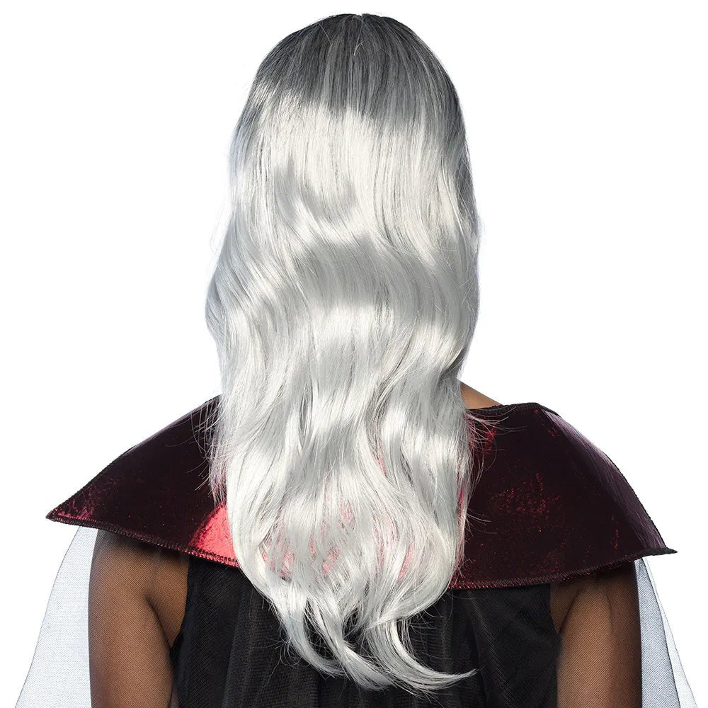 Una preciosa peluca gótica para mujer con pelo largo rizado y flecos de cortina. La peluca tiene un color blanco-grisáceo que le da un aspecto oscuro, por lo que puede utilizarse perfectamente como complemento de un disfraz de vampiro espeluznante y sexy para Halloween.