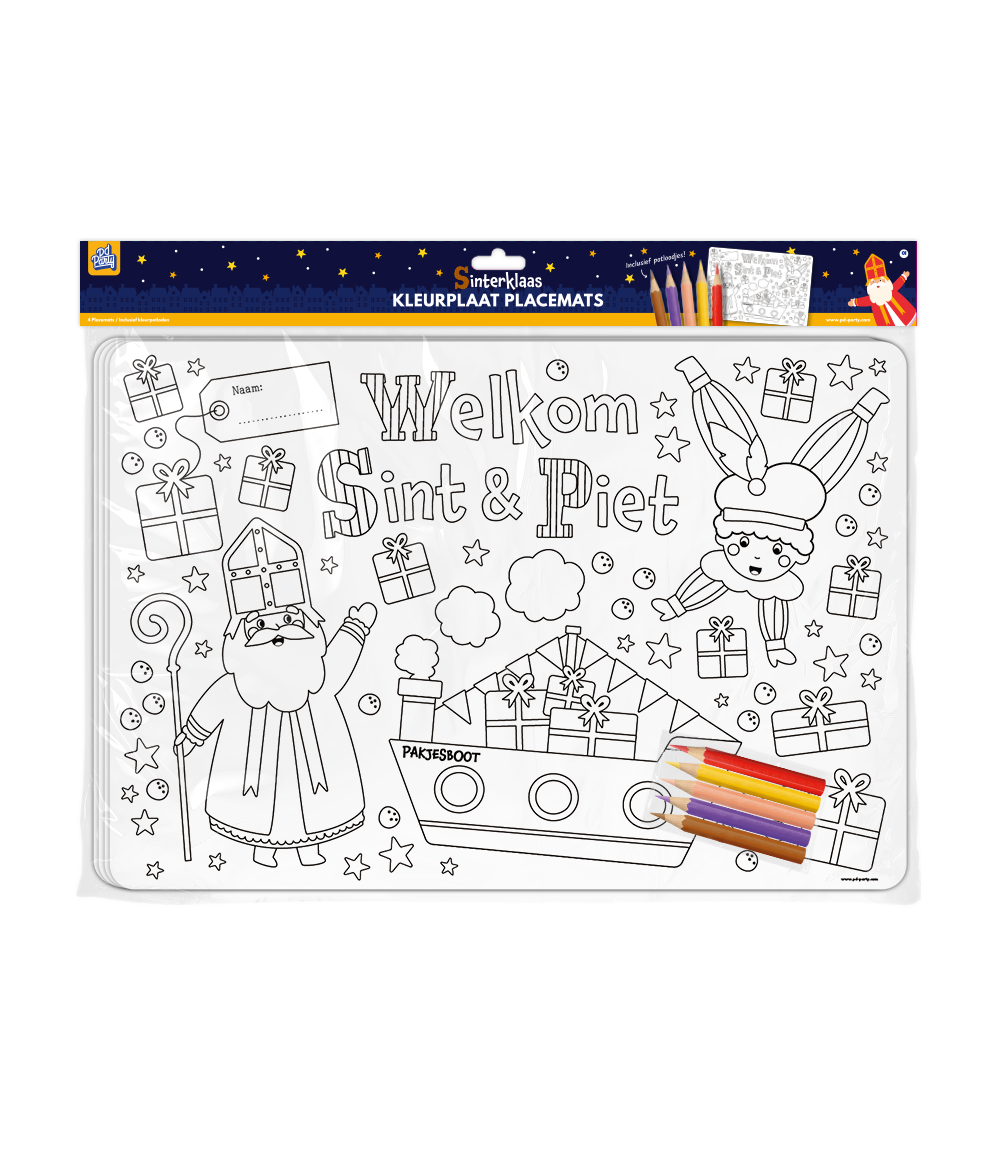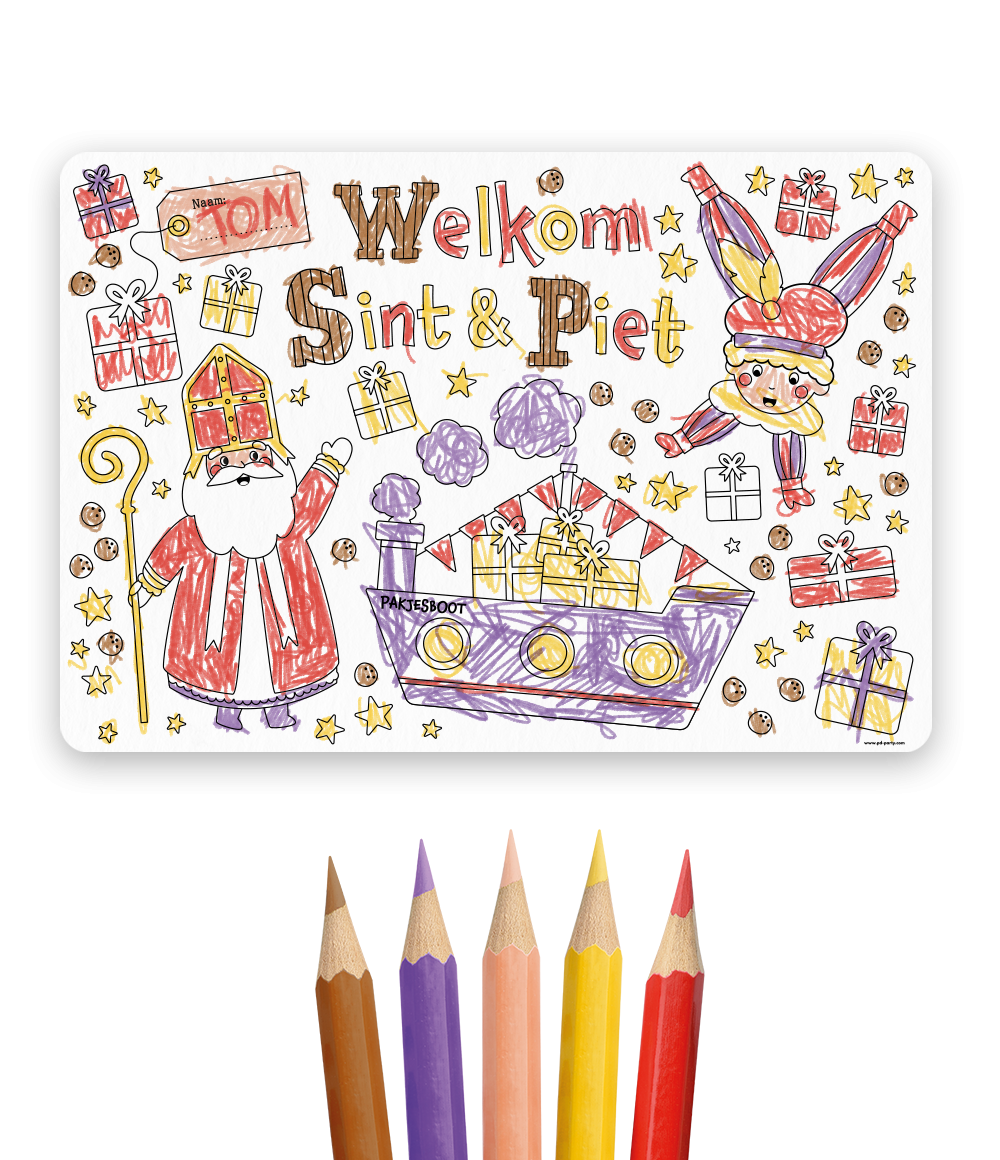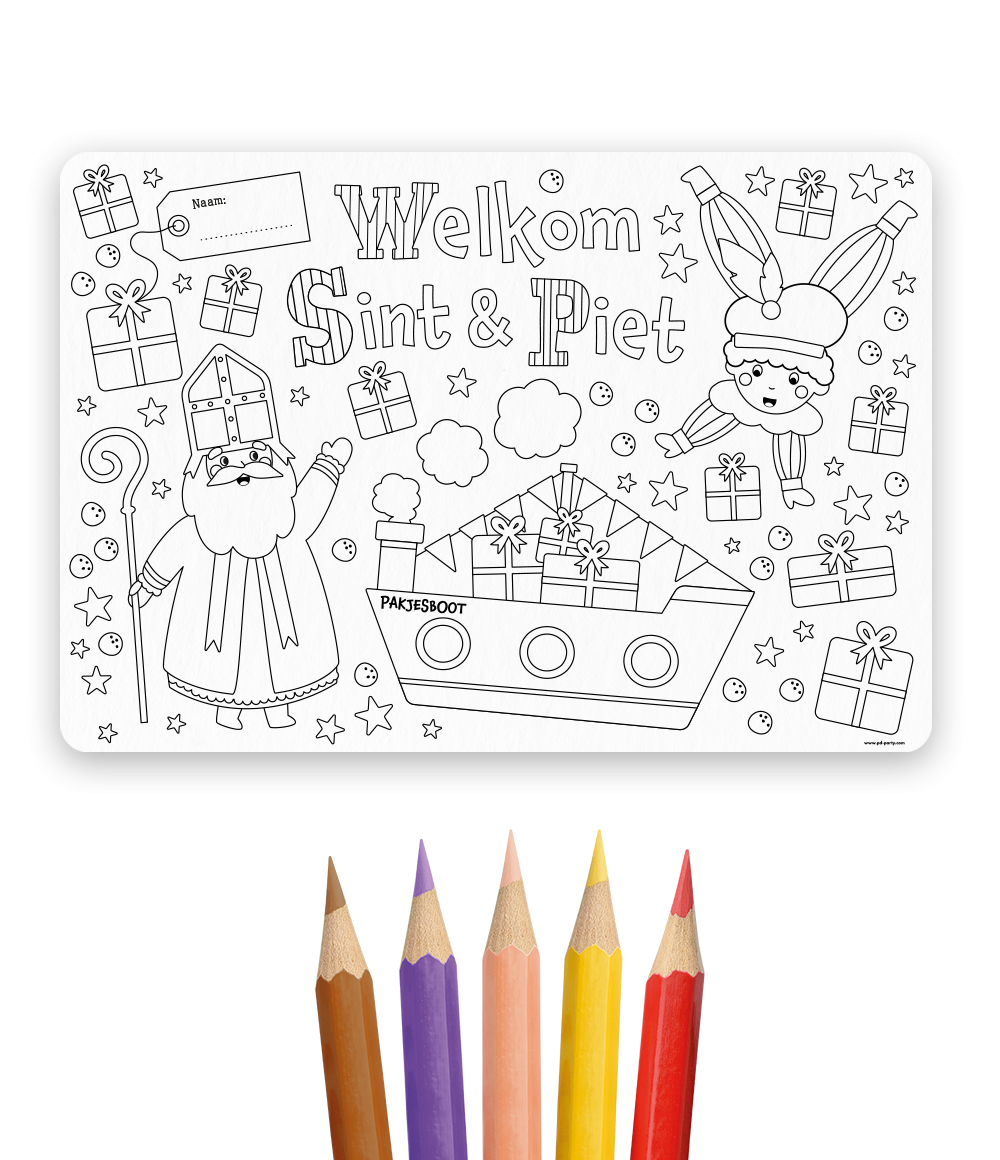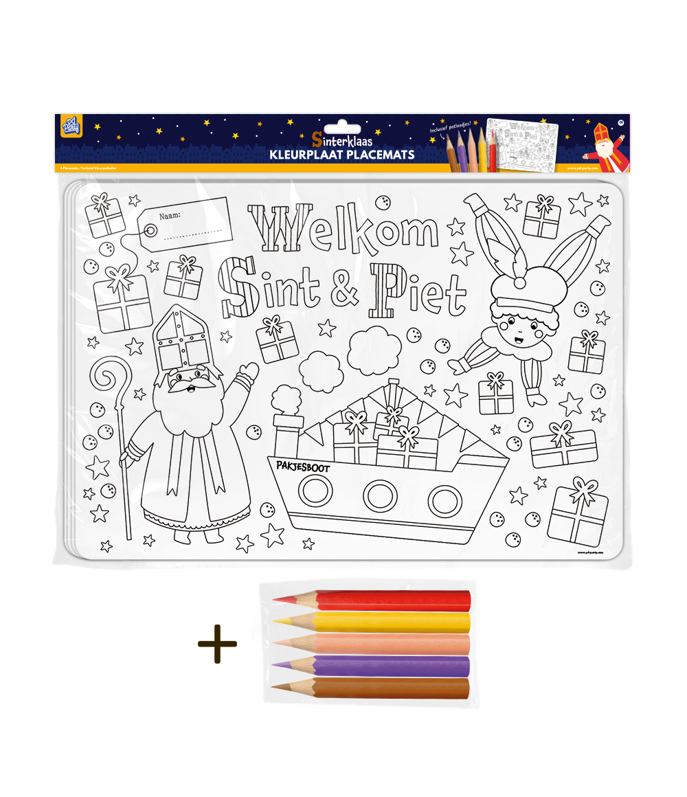 Añade color y calidez a la fiesta de Sinterklaas con estos coloridos manteles individuales. Los manteles individuales están impresos con alegres ilustraciones de Sinterklaas que los niños (¡y los adultos!) pueden colorear ellos mismos. Así, la mesa no sólo estará decorada festivamente, sino que también será una zona de juego creativo.