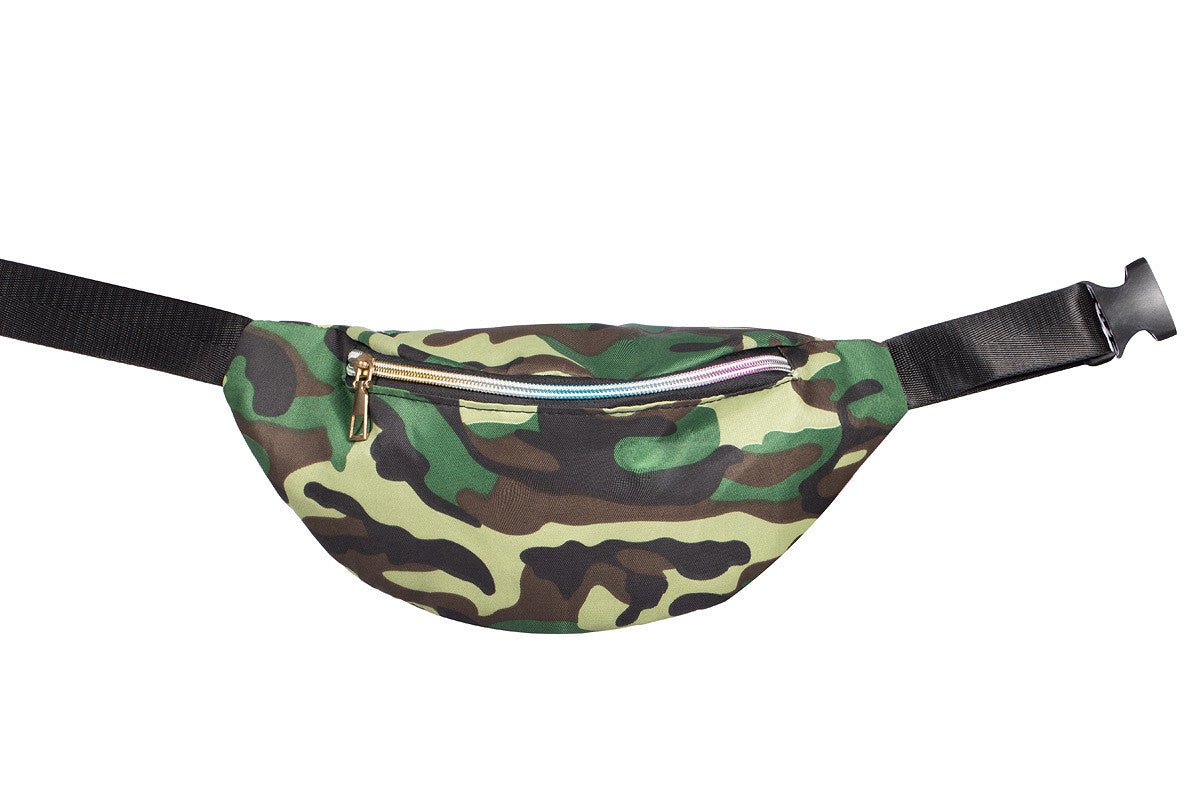 Resistente bolsa de cadera con estampado militar en verde, marrón y negro. Ideal como accesorio para fiestas temáticas, fiestas de disfraces o festivales.
