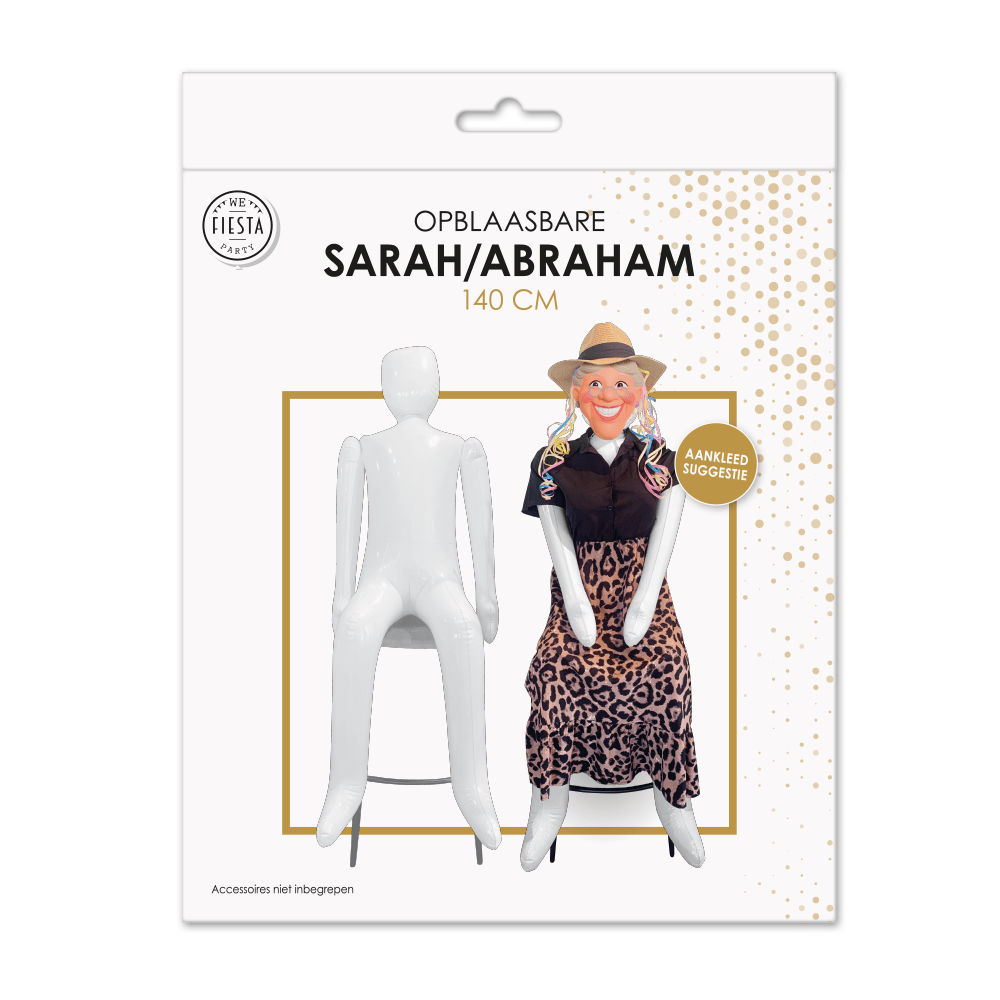 Haz que cualquier cumpleaños o hito sea extra festivo con este muñeco hinchable Abraham/Sarah de 145 × 48 cm. Ideal para celebrar un 50 cumpleaños u otros aniversarios. El muñeco es fácil de inflar y apto para decoración de interior y exterior. El muñeco viene sin decoración.