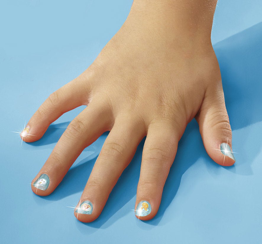 - 1 bote de esmalte de uñas, 1 bote de esmalte con purpurina, pegatinas para uñas y lima