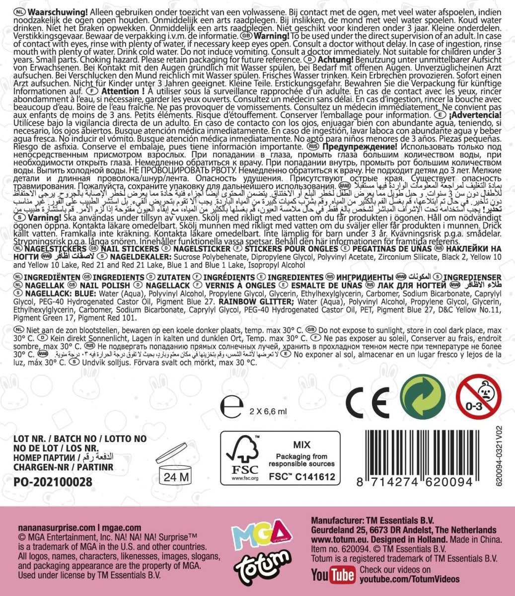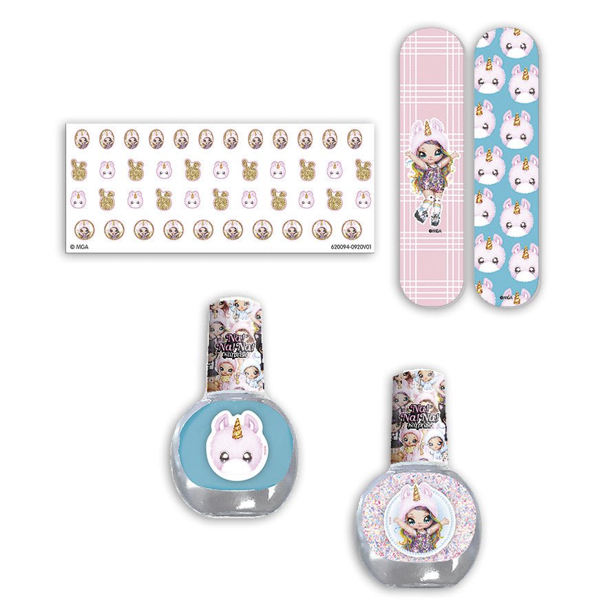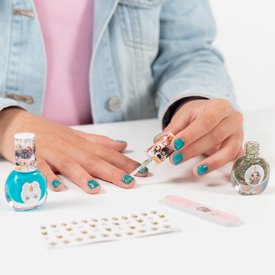 ¡Guau! ¡Con este set de decoración de uñas de Britney & belleza de unicornio basado en las muñecas coleccionables más monas de NaNaNa! más bonitas, serás el centro de todas las miradas. Aplica los adhesivos entre la capa inferior y la superior de purpurina para obtener los mejores resultados. El set con 2 frascos de lima de esmalte de uñas y pegatinas se presenta en una bolsa de mano transparente súper mona con un mini pompón. y disponible en 3 combinaciones de colores: Aspen con purpurina perla/azul, Britney con purpurina azul claro multicolor, y Sarah con purpurina rosa claro/oro. Pon bonitas tus uñas junto a tus amigas y colecciónalas todas.