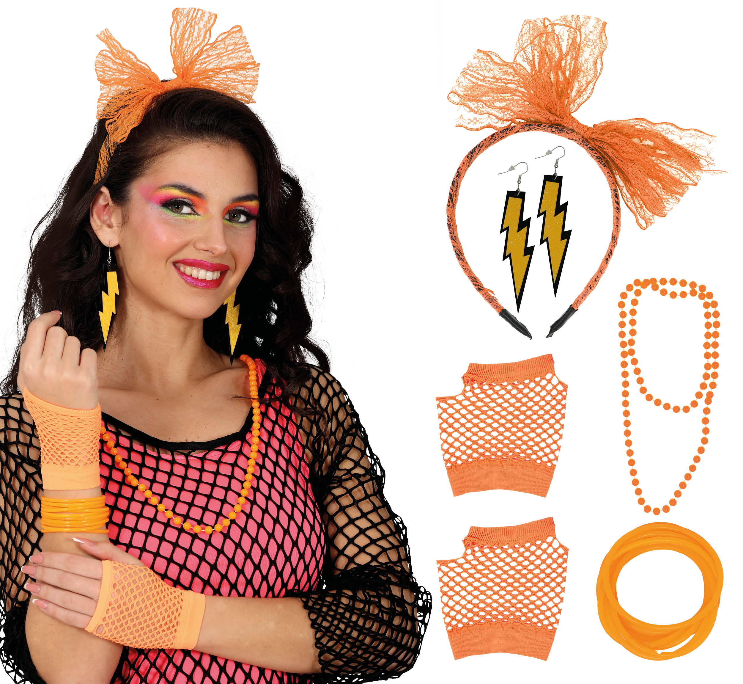 ¡Retrocede en el tiempo con estos accesorios de neón de los 80 y da vida al estilo retro de esta década llena de color! Perfectos para una fiesta temática, carnaval o cualquier otra ocasión en la que quieras destacar con un estilo que nunca pasa de moda. Este conjunto de 5 piezas ofrece todo lo que necesitas para completar tu look.